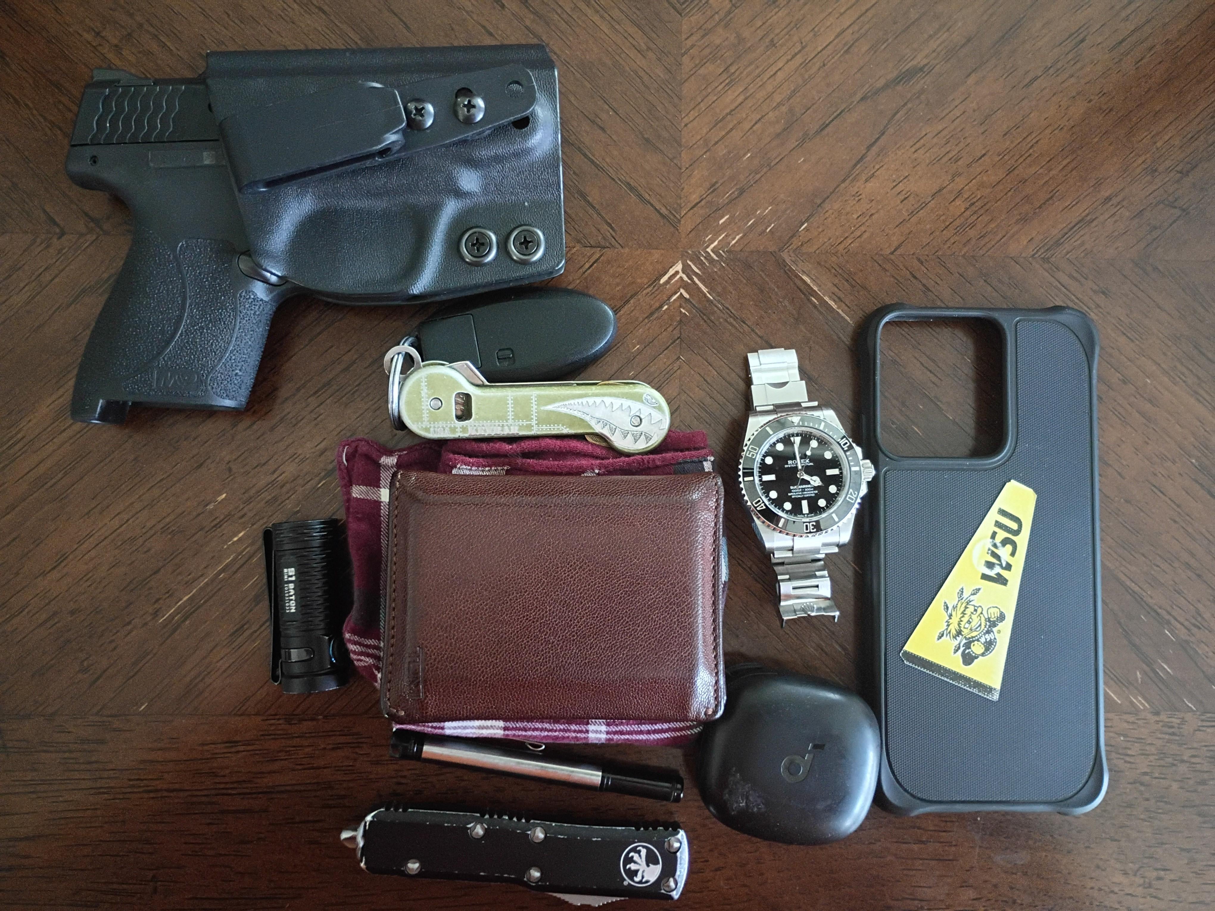 In EDC Dallas Daily March 16, 2026 S&W Shield 9mm Key Bar Small Olight Wallet and Handkerchief Zebra Pen Microtech OTF Rolex No Date Sub Earbuds Cheap Android Phoneby entropicitis EDC Prev Post New Flytanium Lotus G10 scales March 16, 2026 Next Post EDC Simple, Drawing+ March 16, 2026 Related Posts My try of EDC (19yrs Student) March 17, 2026 My EDC March 17, 2026 NTD: SOG Powerpint plus updated EDC March 17, 2026 1 Comment AutoModerator 22 hours ago Thank you for posting to r/EDC! Include a detailed item list (make/model) within **1 hour** of submission. Lists can go in the title, a comment, or the image. Posts without lists will be removed. If you have already provided a list, not further action is needed, thanks | [FAQ](https://www.reddit.com/r/EDC/wiki/faq)*I am a bot, and this action was performed automatically. Please [contact the moderators of this subreddit](/message/compose/?to=/r/EDC) if you have any questions or concerns.*Write A CommentYou must be logged in to post a comment.