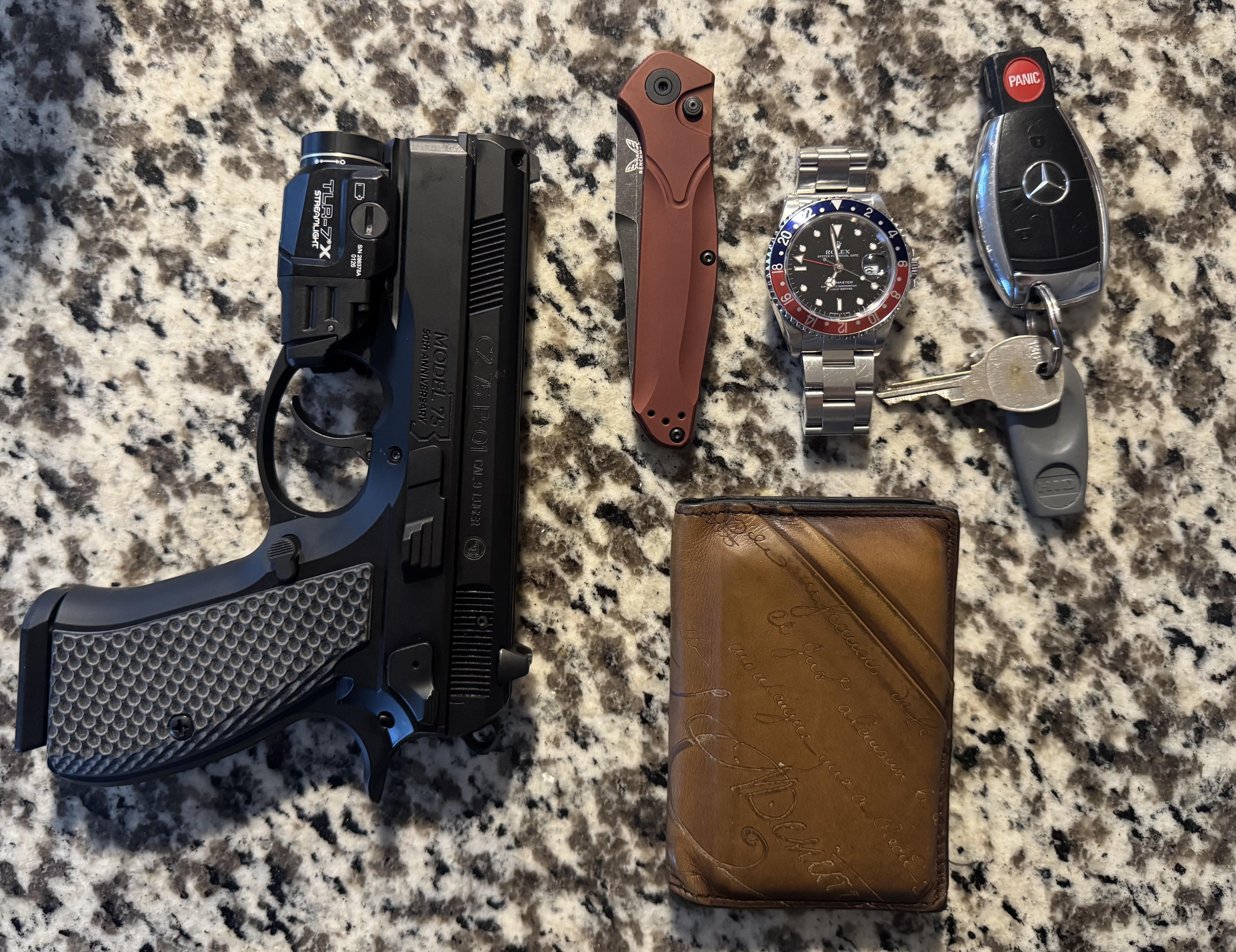 In EDC (28M) Marine Officer Off-Duty March 16, 2026 Benchmade Auto OsborneRolex GMT-Master ref. 16700Berluti wallet2009 Mercedes E550CZ P-01 w/ TLR-7X light and Lok gripsby ncaj33 EDC Prev Post Modded Military 2 March 16, 2026 Next Post Hand-forged carbon steel (leaf spring) with bone handle advice on tuning? March 16, 2026 Related Posts It has been a while so March 18, 2026 What is this black ring made of? Or which brand does it come from? Are they all from Ridge? March 18, 2026 First time posting here March 18, 2026 1 Comment AutoModerator 1 day ago Thank you for posting to r/EDC! Include a detailed item list (make/model) within **1 hour** of submission. Lists can go in the title, a comment, or the image. Posts without lists will be removed. If you have already provided a list, not further action is needed, thanks | [FAQ](https://www.reddit.com/r/EDC/wiki/faq)*I am a bot, and this action was performed automatically. Please [contact the moderators of this subreddit](/message/compose/?to=/r/EDC) if you have any questions or concerns.*Write A CommentYou must be logged in to post a comment.