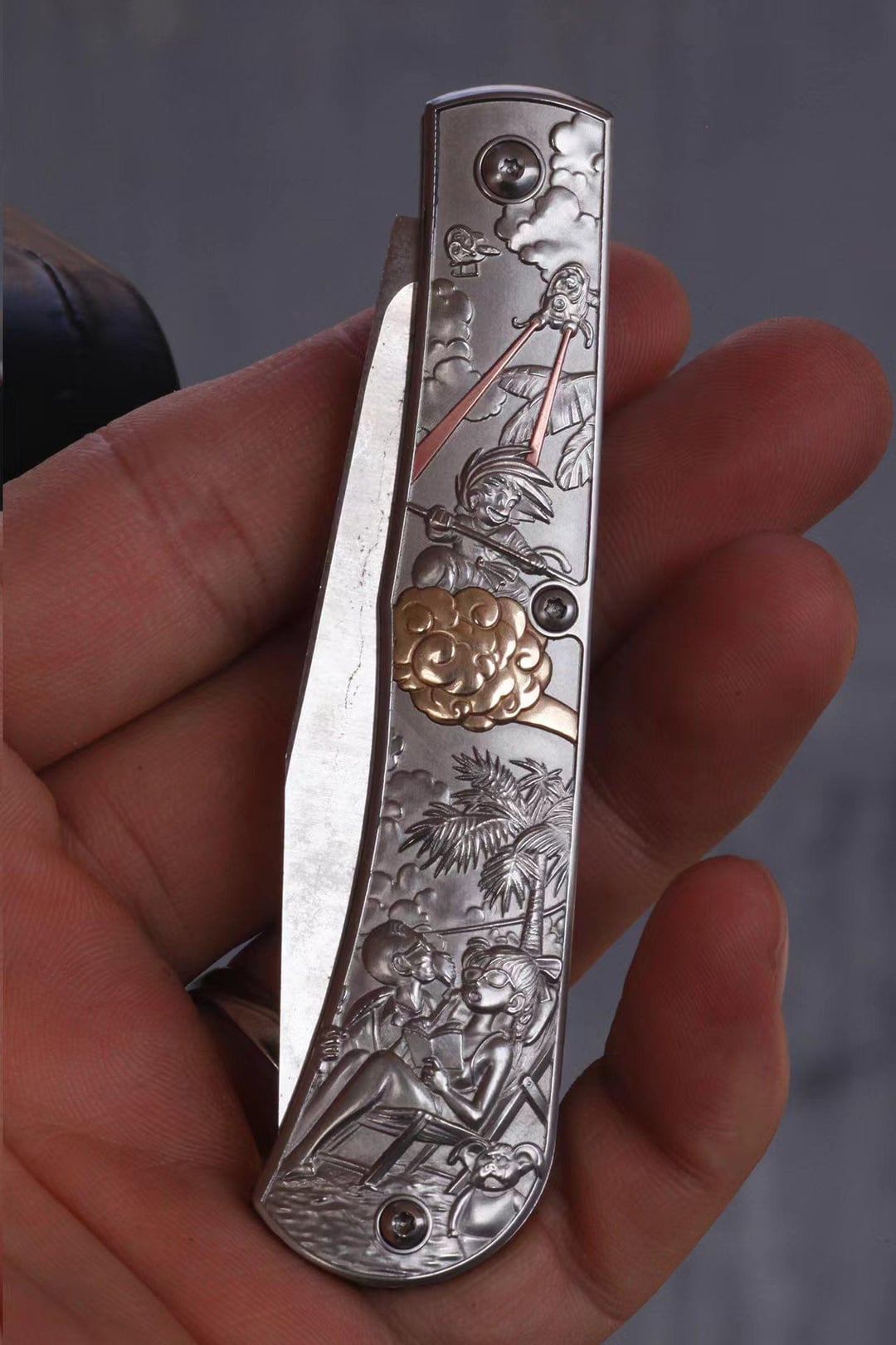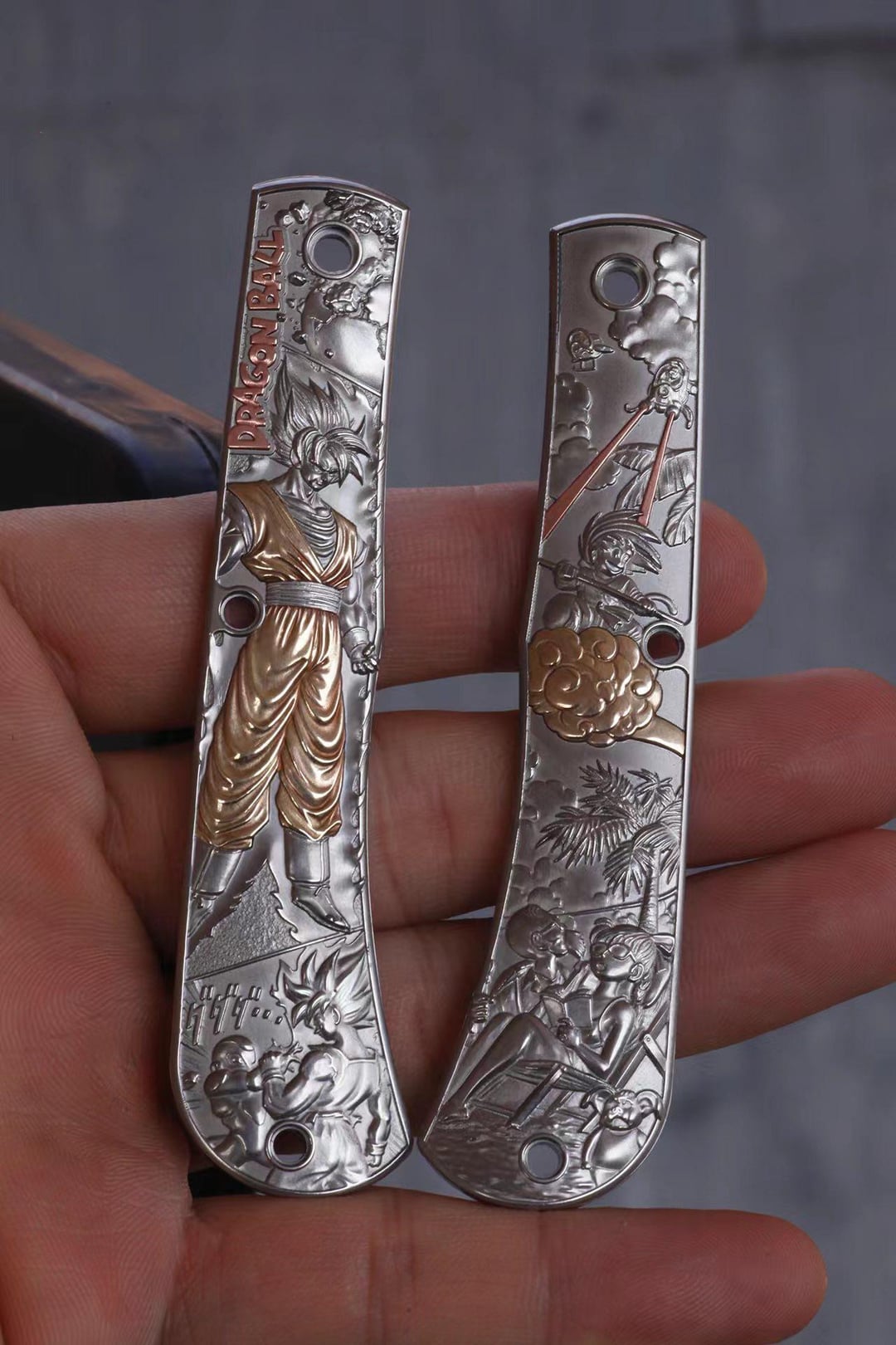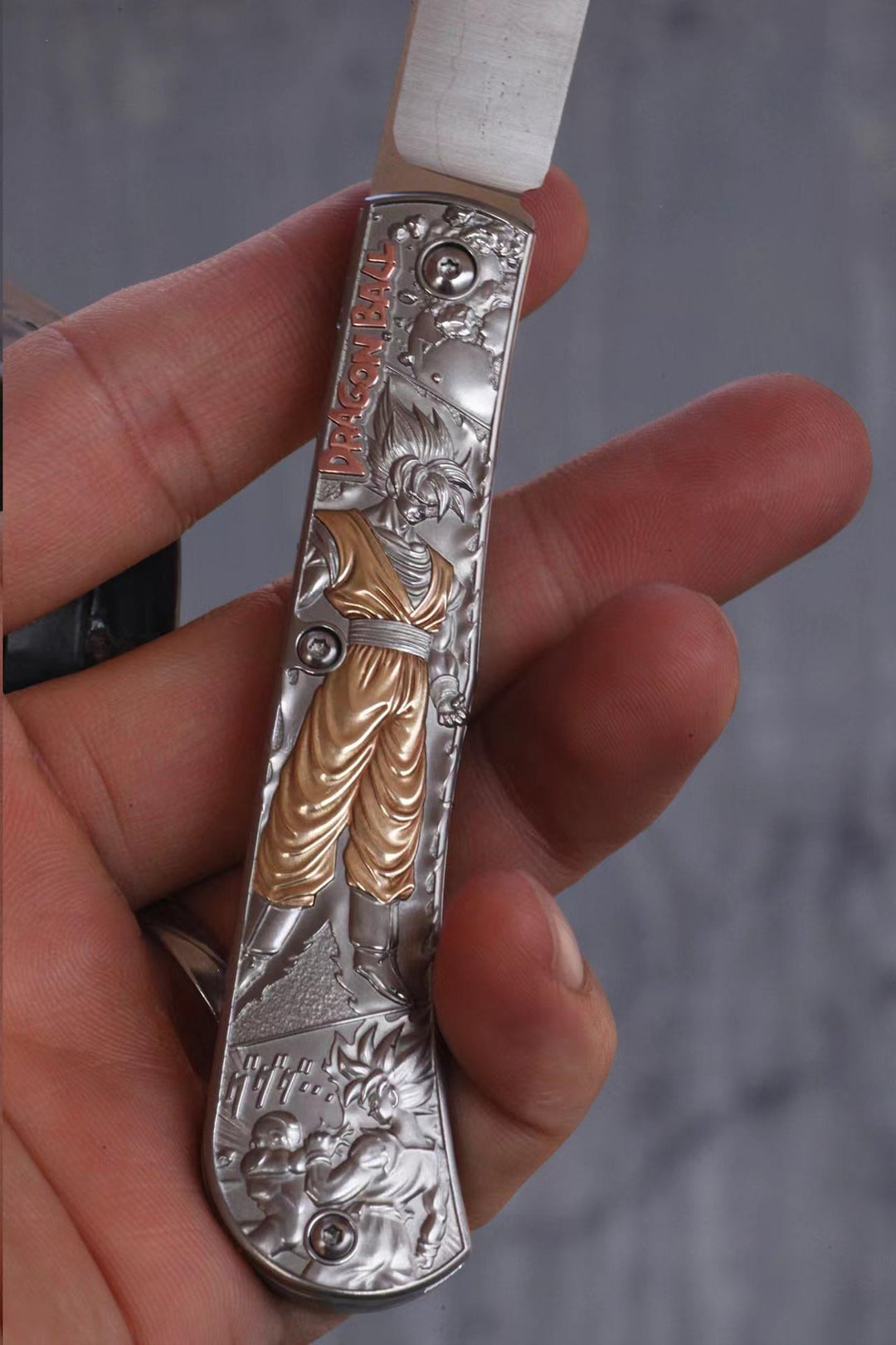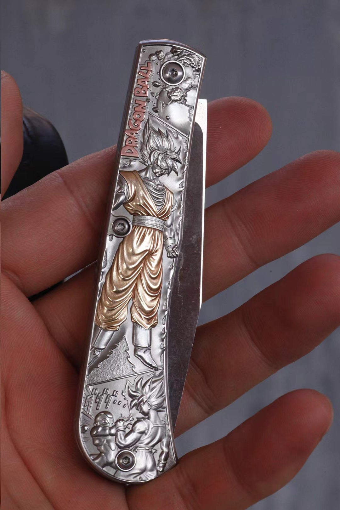 The handle is crafted from titanium, featuring intricate relief engraving with brass and copper inlays. The design draws heavily from Dragon Ball elements—flying clouds, energy beams, and a playful scene that captures that adventurous spirit we all grew up with.