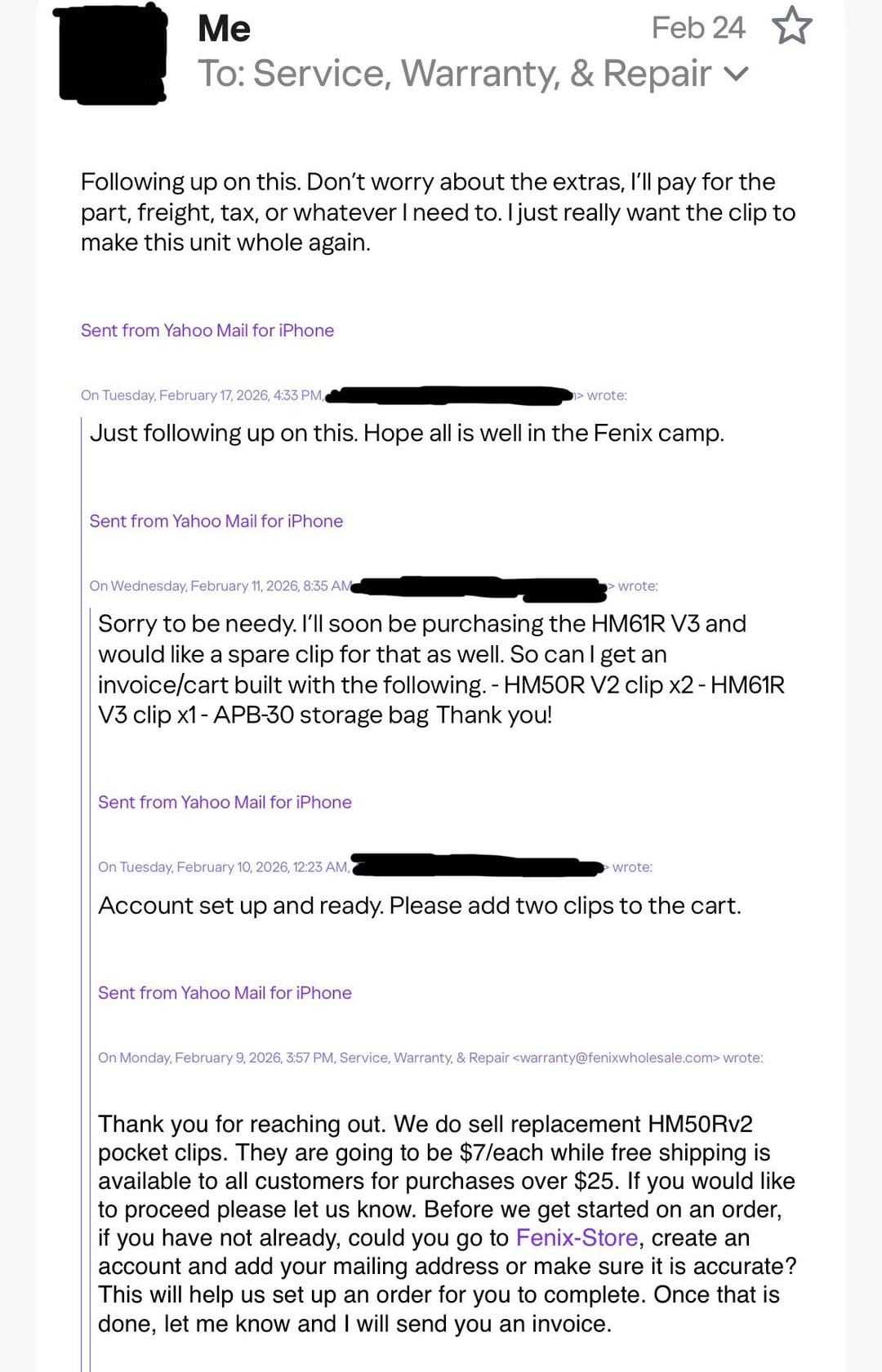 After a day, I responded again. Figuring that a $7 clip may not be worth the hassle so I asked to order the clips along with some new products I had been eyeing to sweeten the deal. No response.