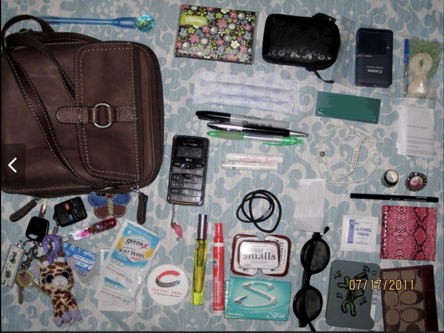 Full list of artifacts: Shaker pen, tissue, cannon case, cannon battery charger, beads with seam ripper, Fossil crossbody (still have), tampons, pens, work name tag, random paper, 2 rings, wrap bracelet, soft lips, LG flip phone, hair ties, colorstay eyeliner (black), pink snake print mirror, alcohol prep pad, random paper, Coach coin purse (still have), birth control pills, Harry Potter 3D movie glasses, 3 cans of mints, stride gum, tide pen, DKNY roll-on perfume, commercial mints, Germ-X, keys to 1999 yellow convertible Ford Mustang GT with giraffe plush fob.