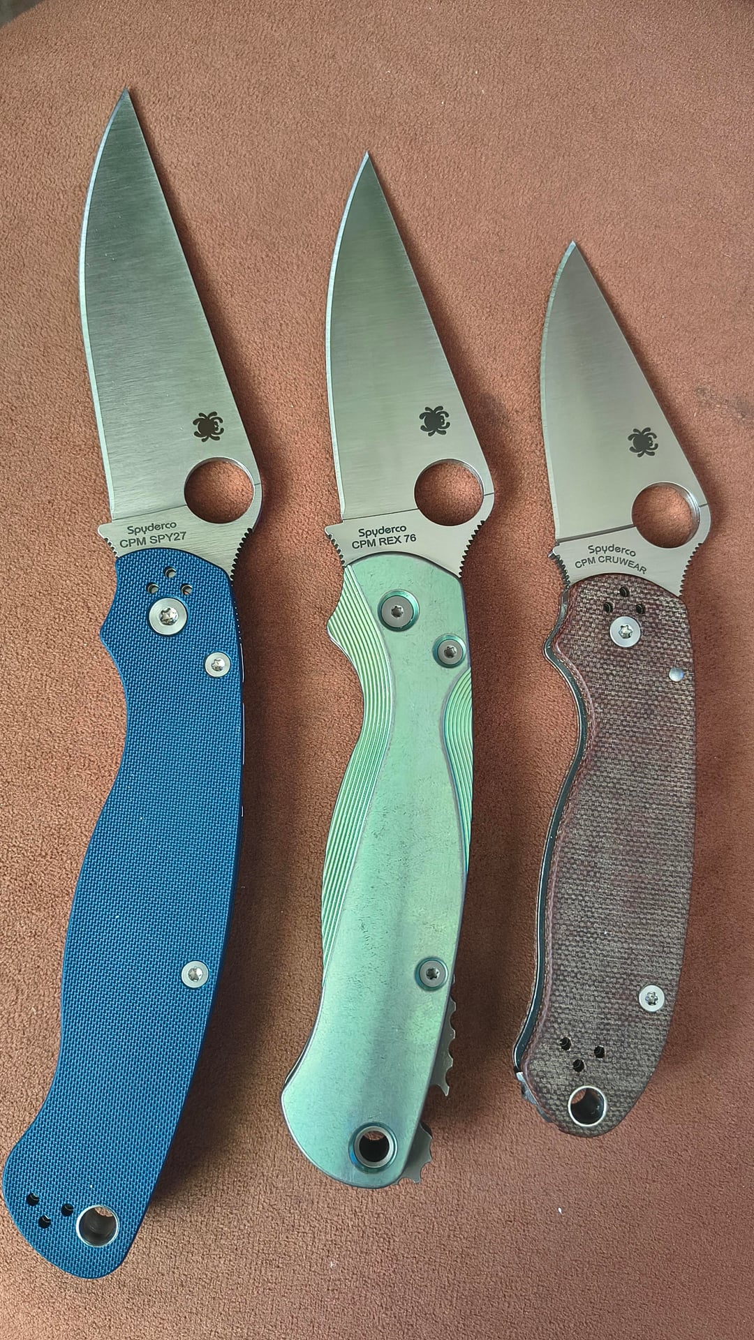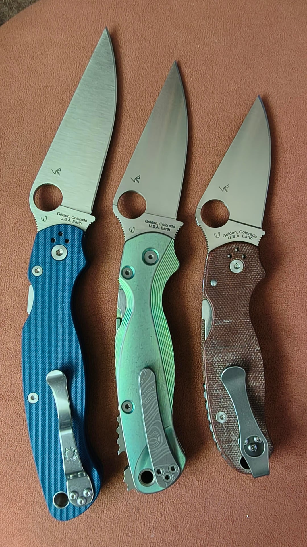 The Military 2 is bone stock so far, haven't done anything to it yet other than lube it (and flip it a few hundred times). The REX76 PM2 is wearing Flytanium Lotus scales in the custom "Terra Firma" finish, with a Ripp's Garage Tech clip, Brewhawk backspacer, and hardware in (Topo) Apocalyptic Bronze finish. The Crucarta PM3 is just a MXG clip and a gear backspacer from Rockscale Design.