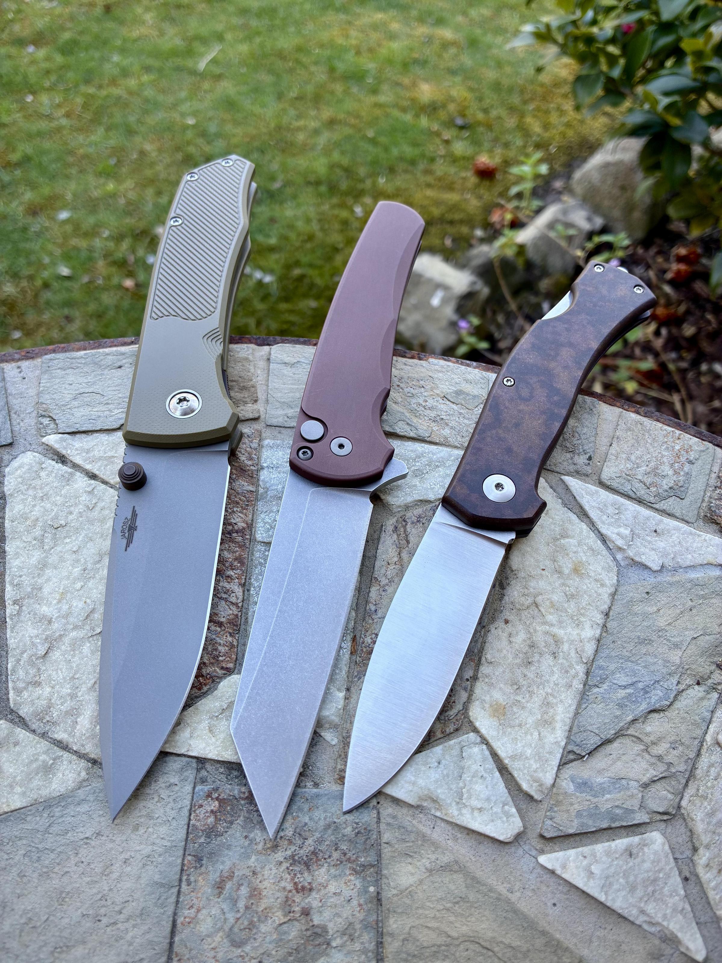 The Jarosz is in AEB-L, the ProTech in MagnaCut, and the Casstrom in 14C28N. They’re each awesome.