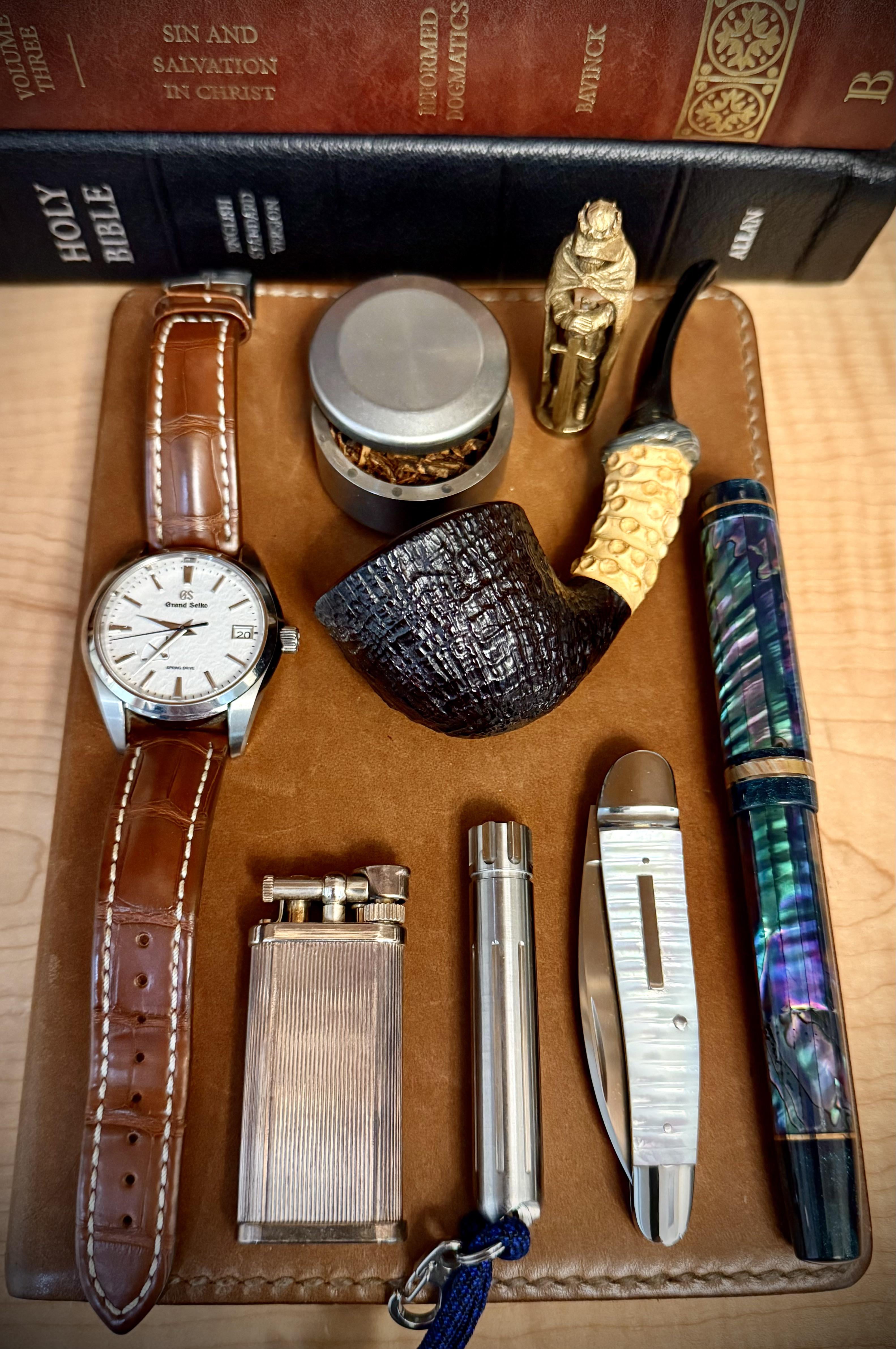 In EDC Mother of Pearl Friday March 20, 2026 Grand Seiko “snowflake”, PSD products titanium capsule, knight pipe tamper, J Mouton pipe, Dunhill unique lighter, McGizmo/Kosen sapphire flashlight, Ohta slipjoint, Atelier Lusso fountain penby claptrap310 EDC Prev Post First post, hi, two new delievered March 20, 2026 Next Post opinel March 20, 2026 Related Posts Who else EDCs a ball cap? My bald head is sensitive to the sun… March 22, 2026 Applebee’s Kit March 22, 2026 Daily drivers March 22, 2026 1 Comment AutoModerator 2 days ago Thank you for posting to r/EDC! Include a detailed item list (make/model) within **1 hour** of submission. Lists can go in the title, a comment, or the image. Posts without lists will be removed. If you have already provided a list, not further action is needed, thanks | [FAQ](https://www.reddit.com/r/EDC/wiki/faq)*I am a bot, and this action was performed automatically. Please [contact the moderators of this subreddit](/message/compose/?to=/r/EDC) if you have any questions or concerns.*Write A CommentYou must be logged in to post a comment.