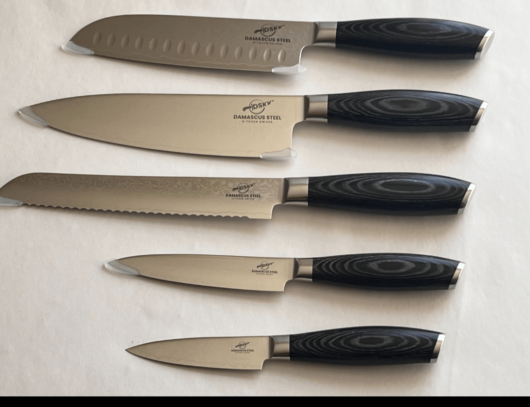 Went with a mix of chef, santoku, bread, and utility knives — all Damascus steel with the same handle design so it feels consistent in hand.