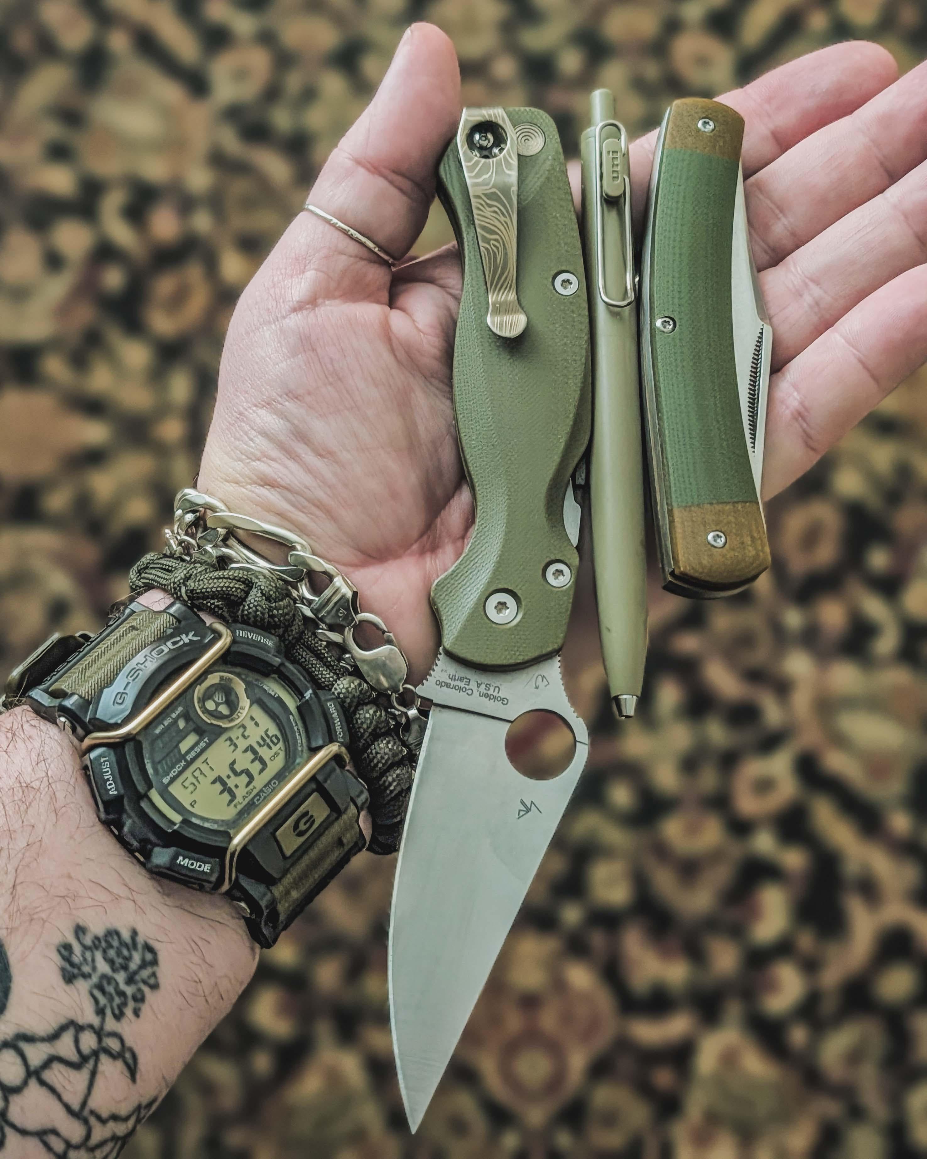 G-Shock GD-400, Spyderco PM2 in S45VN w/ Flytanium G10 Lotus scales & bronze anodized lanyard delete, & LunchNW topo clip, Uni-Ball One P, and Rough Ryder G10 Moose. 💚