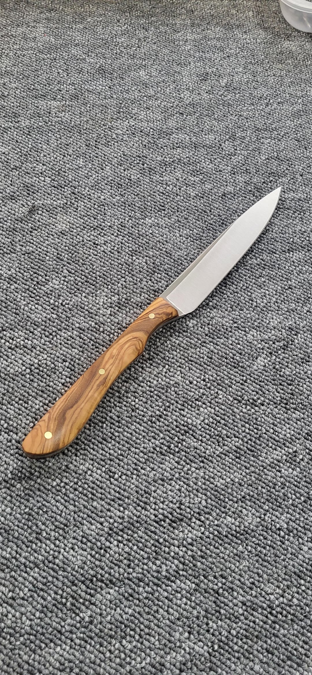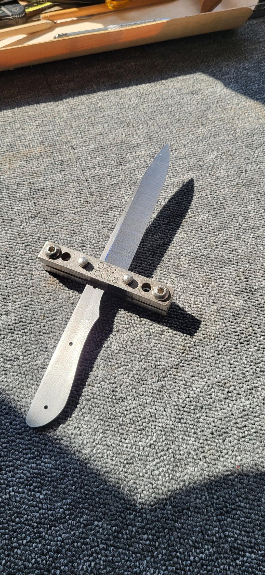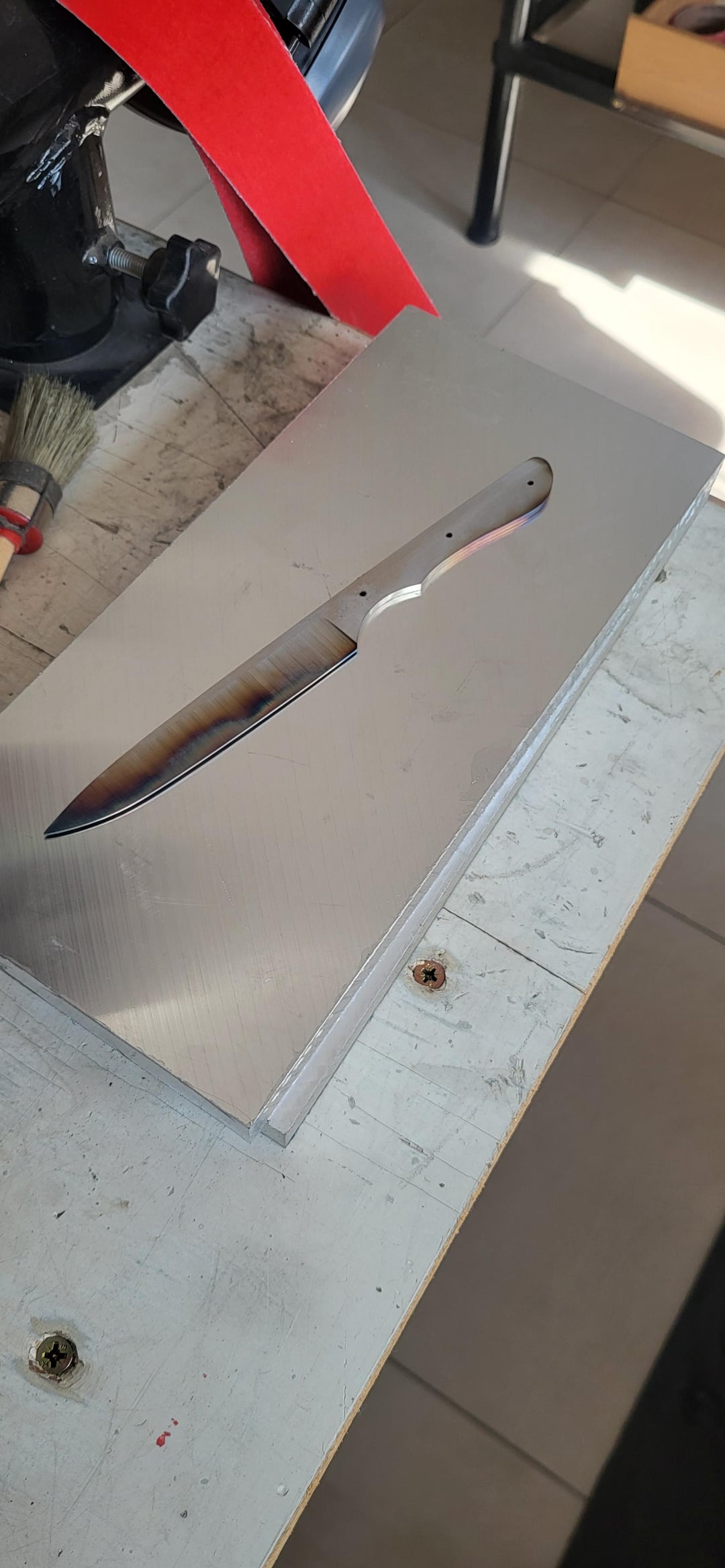 Aujourd’hui, je suis allé chez un coutelier. J’ai créé mon couteau du début à la fin : la forme de ma lame et de mon manche. Nous avons fait le traitement thermique. J'ai réalisé une émouture creuse comme je le souhaitais.