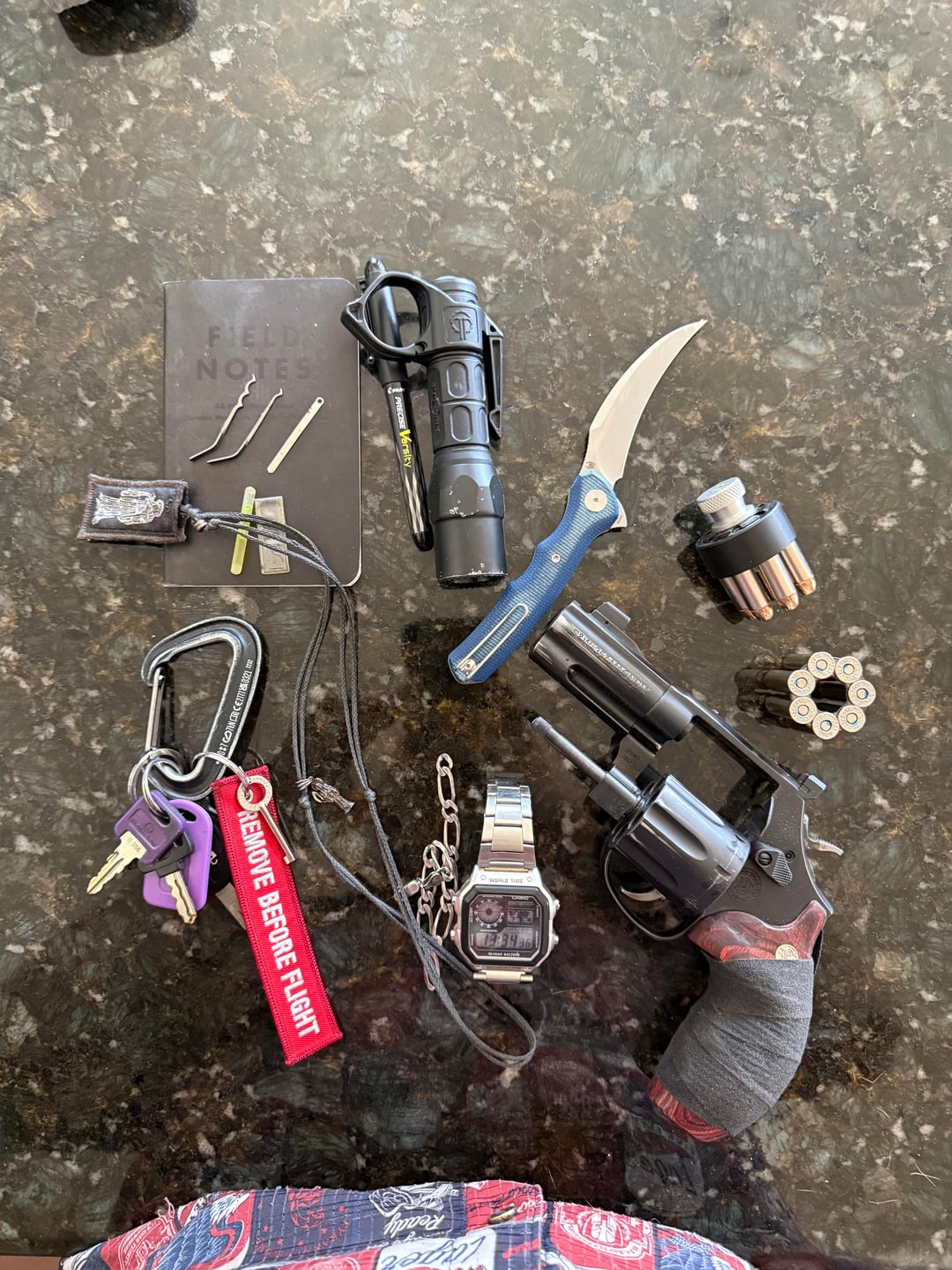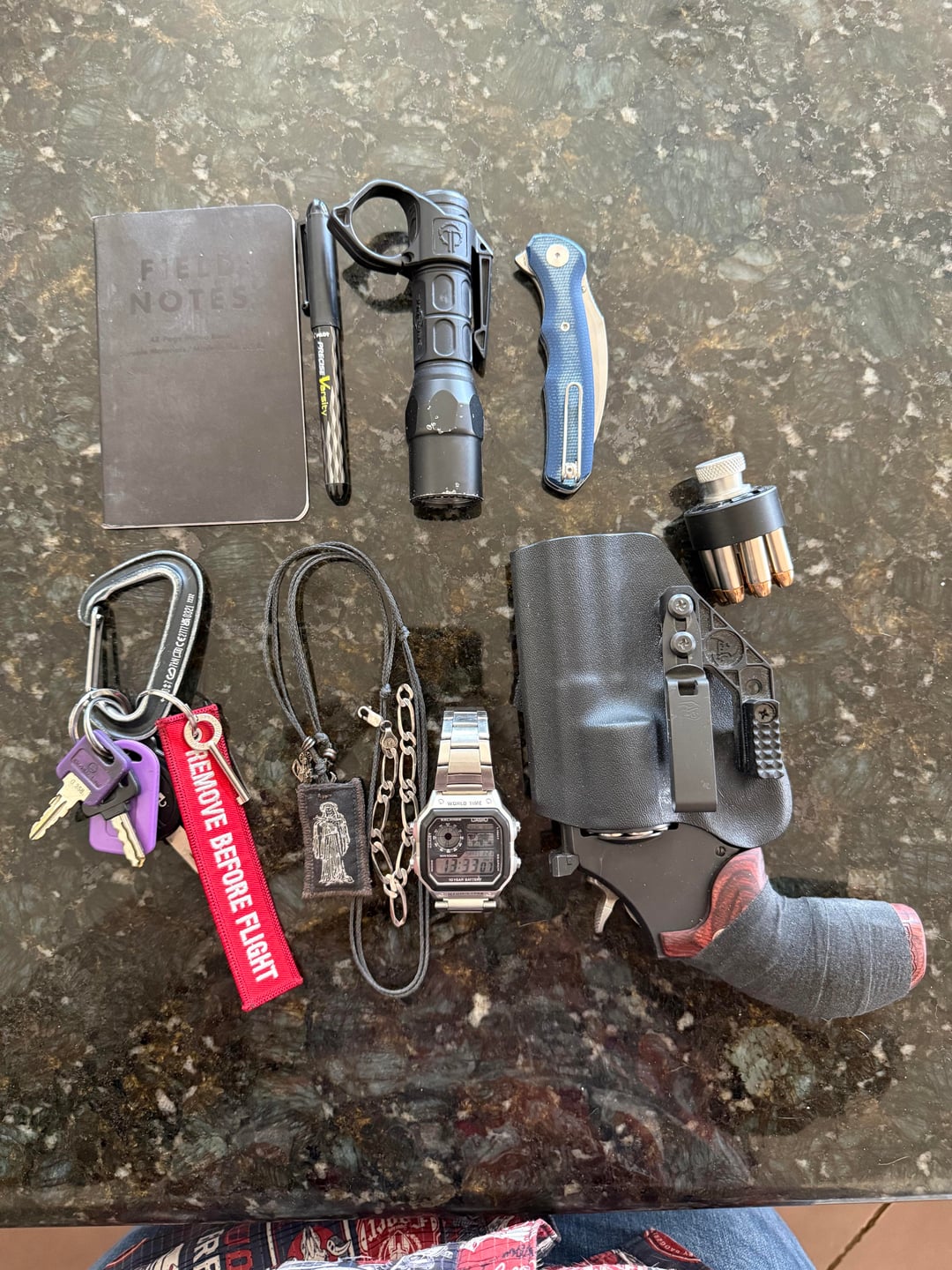 Field notes, pilot varsity, Surefire Gx2 pro with a Thyrm ring, Hks speed loader with federal 154gr HST, S&W 586-7, Casio WR100M, Ed’s manifesto E&E necklace