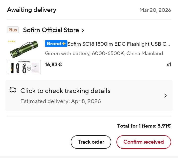 In Flashlight Got my first decent flashlight: Sofirn SC18 for €5.90 March 21, 2026 Got my first decent flashlight: Sofirn SC18 for €5.90by superarugy flashFlashlightlight Prev Post simple, sunny, saturday afternoon March 21, 2026 Next Post C’est moi qui l’ai fait March 21, 2026 Related Posts Need advice: Looking for a hunting headlamp with good range and a wide beam like the one in the photo March 21, 2026 [NMD] S6 glossy SS w/ copper, 519A 1.8KK Dedomed March 21, 2026 NLD! Convoy T4 with Nichia 519a LED/4000k color temp. in titanium body. March 21, 2026Write A CommentYou must be logged in to post a comment.