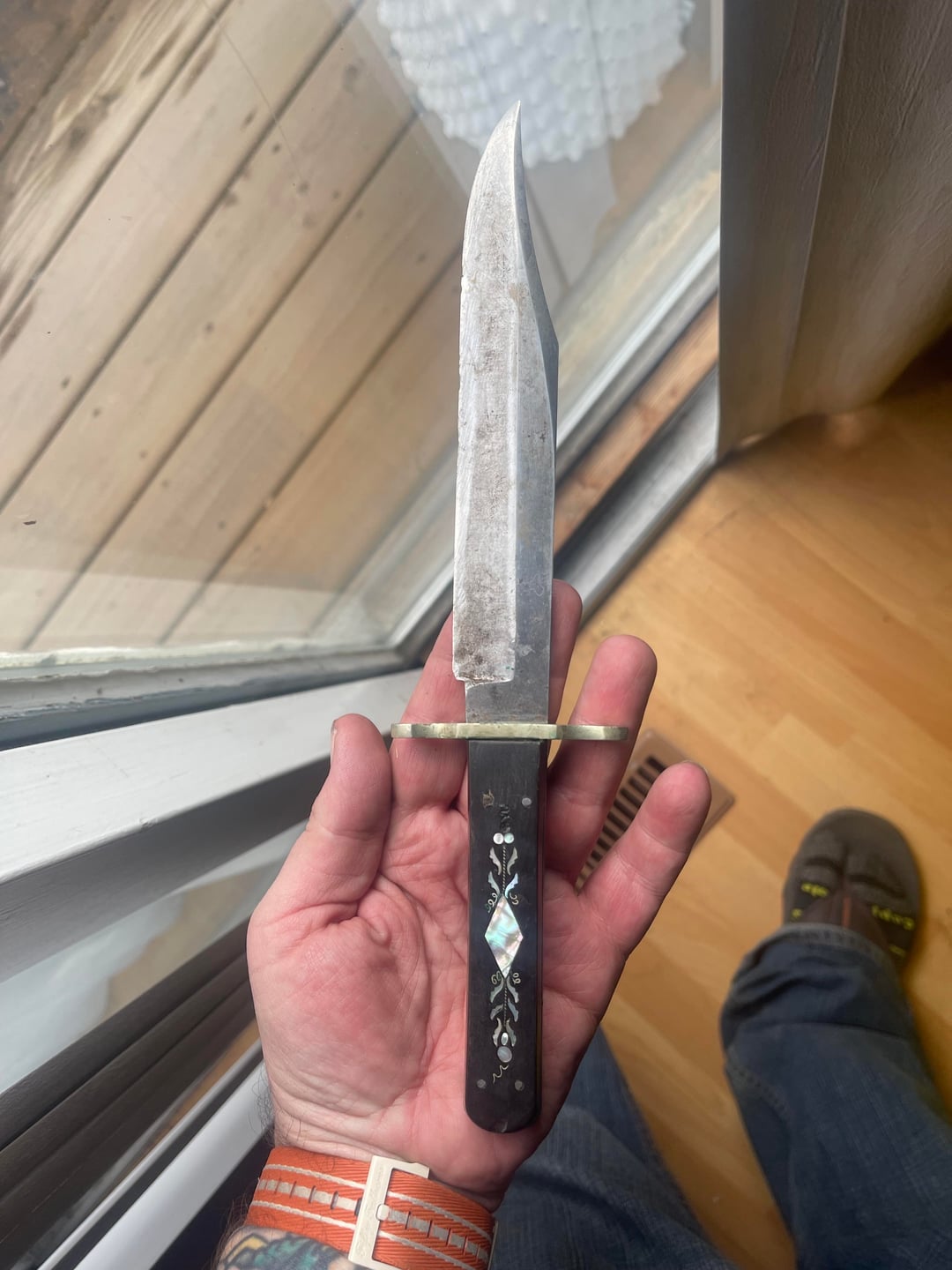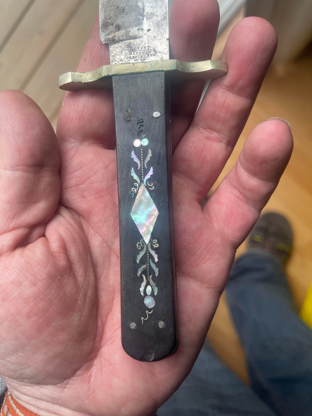 The knife has a full tang, square ish pommel (pics gladly provided) and either ivory or buffalo horn with mother of pearl inlay.