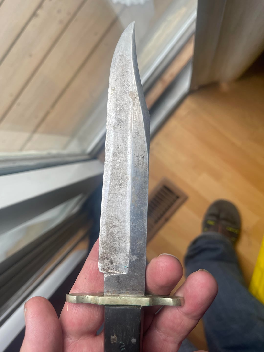 Mostly I think this is an amazing knife with a cool family story. I’m sure it’s worth a couple of bucks but I just want to take the Veragris? Off which I’m just using a wooden toothpick to remove. The brass pommel was more or less covered. I believe it’s caused by storing the blade in the sheath. It is sharp af already. I will not be sharpening it nor cleaning it other than the green crap.