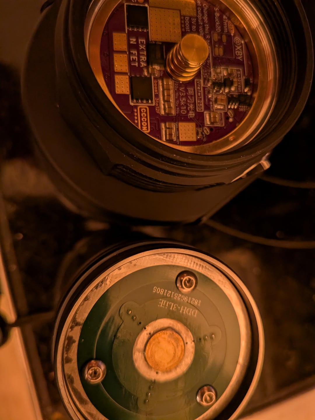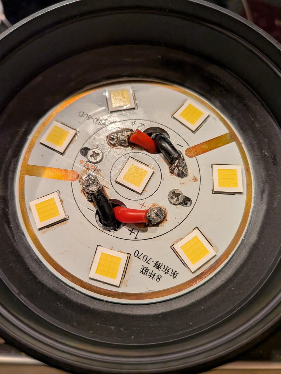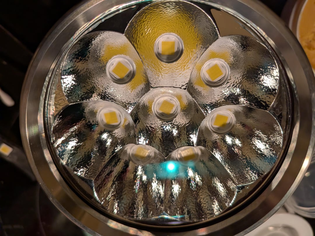 Credit to /u/technoman88 for putting the DDH-F8A on my radar. I managed to order one from Taobao via Superbuy that was sold prebuilt. It came with 6500k 70 CRI LHP73B that I did not like, so I reflowed LHP73B 4000k into this thing. The light is very easy to mod. My soldering iron couldn't quite get hot enough to make nice blobs due to the thick wire and giant MCPCB, but managed.