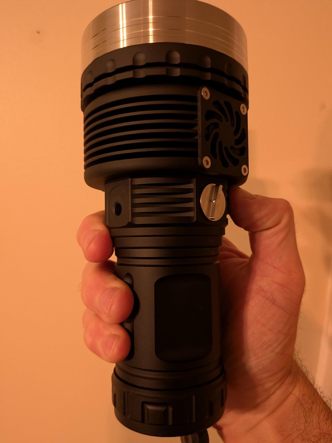 It has two active cooling fans. Uses an XBY 47mm buck driver. It can have an optional 3×21700 carrier or 46950/46120 carriers. The USB-C port has a cool screw-in cover instead of rubber, yay. It has a nice lit switch with a metal decal on the front. There is a green AR lens, which is much appreciated. The MCPCB takes 8x 7070 3v LEDs.