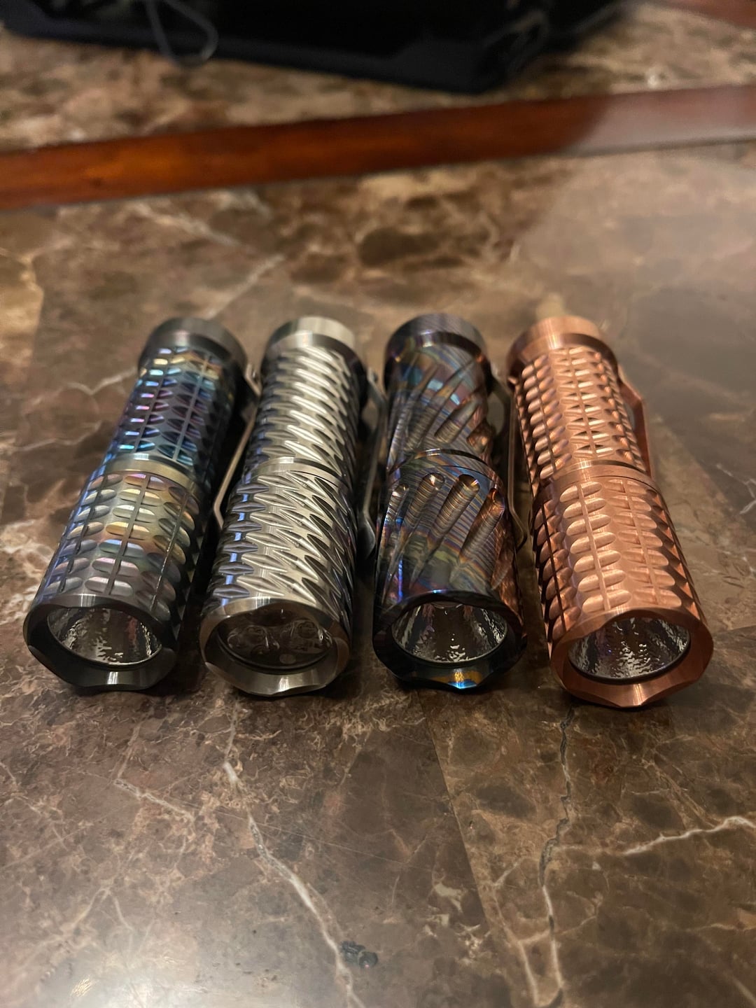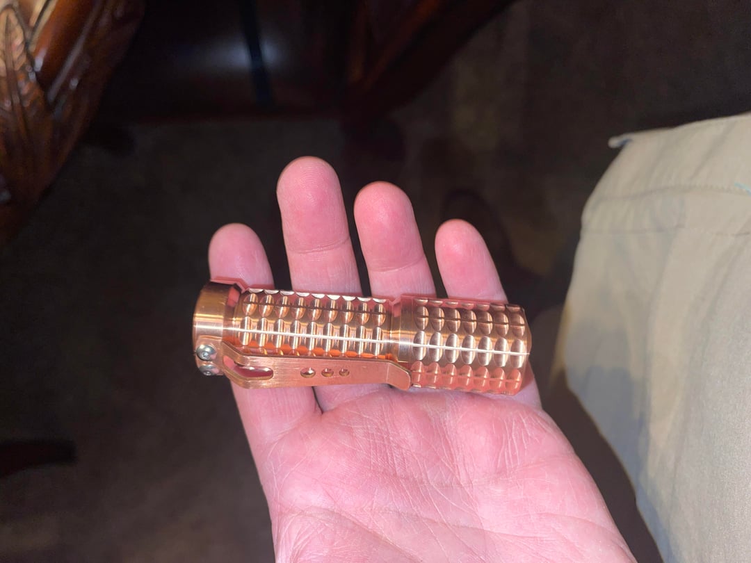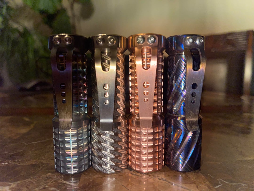 First the was the Ti in with a triple Nichia 519a 3700k. Just got the timascus, copper and zirconium ones today. SST20 5000k single. Works of art. I am very happy with these pocket torches. I feel like I have reached the pinnacle of my pocket torch journey after just a couple months 😆