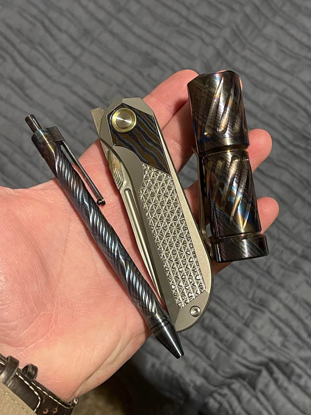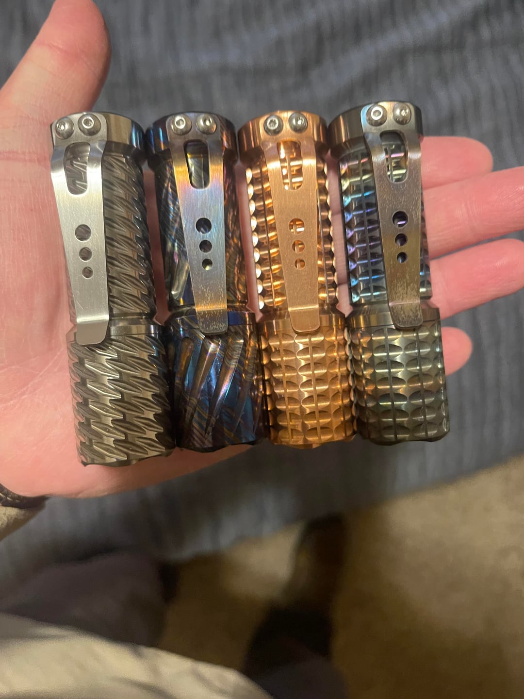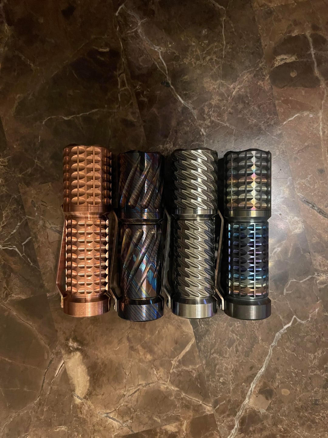 First the was the Ti in with a triple Nichia 519a 3700k. Just got the timascus, copper and zirconium ones today. SST20 5000k single. Works of art. I am very happy with these pocket torches. I feel like I have reached the pinnacle of my pocket torch journey after just a couple months 😆