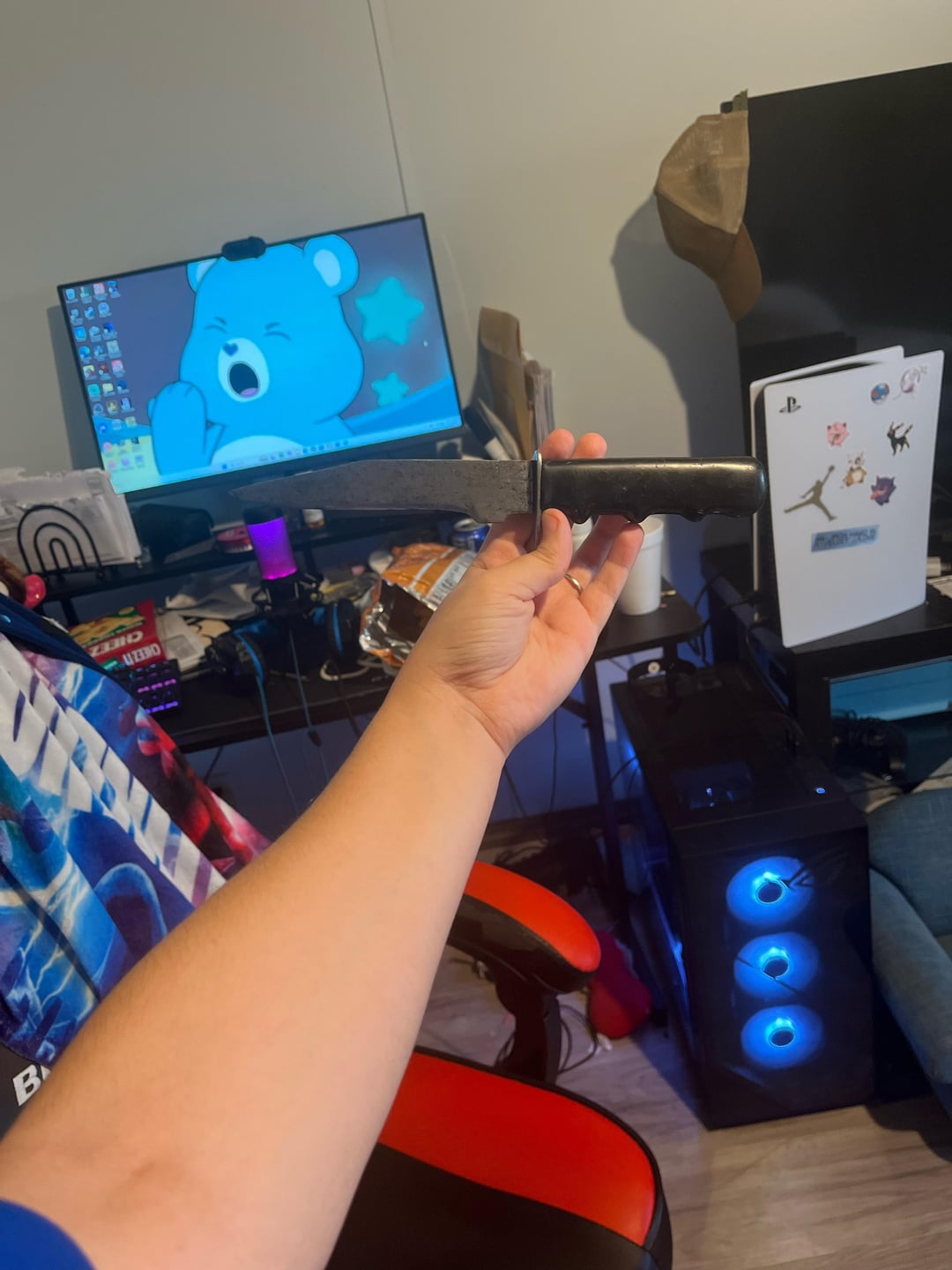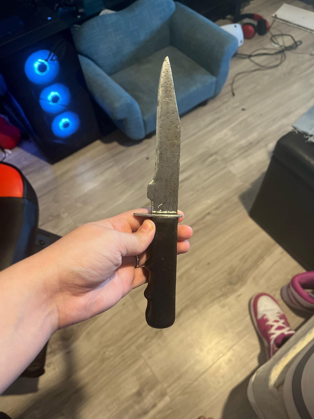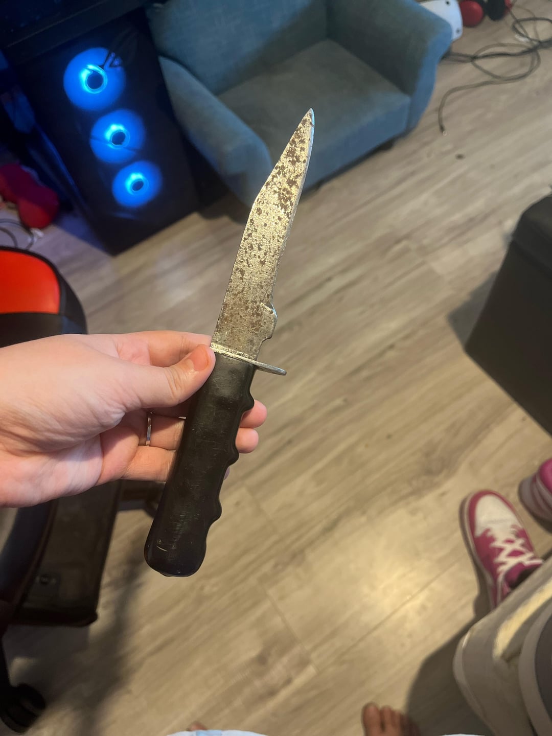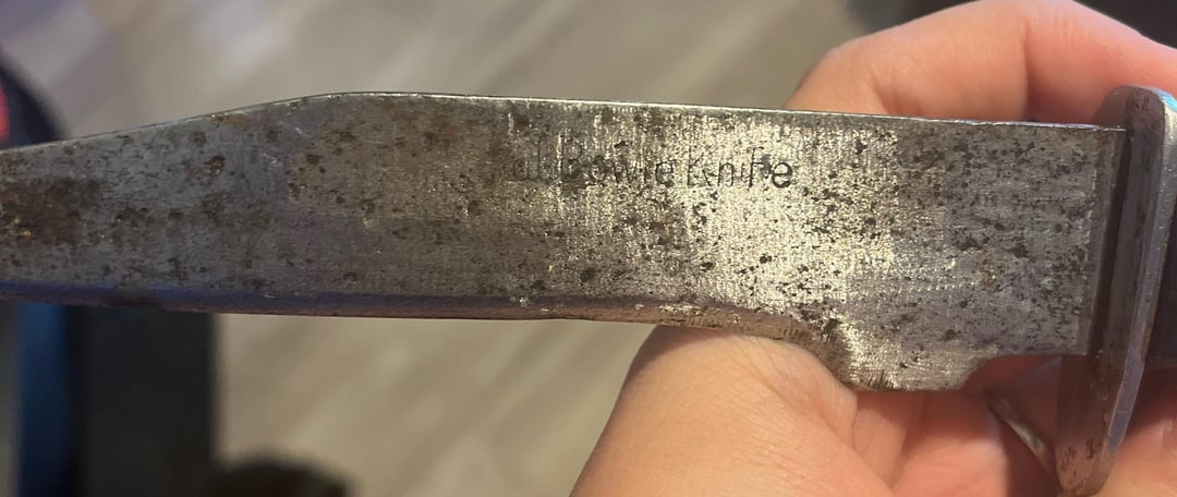 It says something that ends an AL i’m going to assume it says original and then Bowie knife the handle looks like it’s got a few scratches but the blade is rusted like it sit up there for years