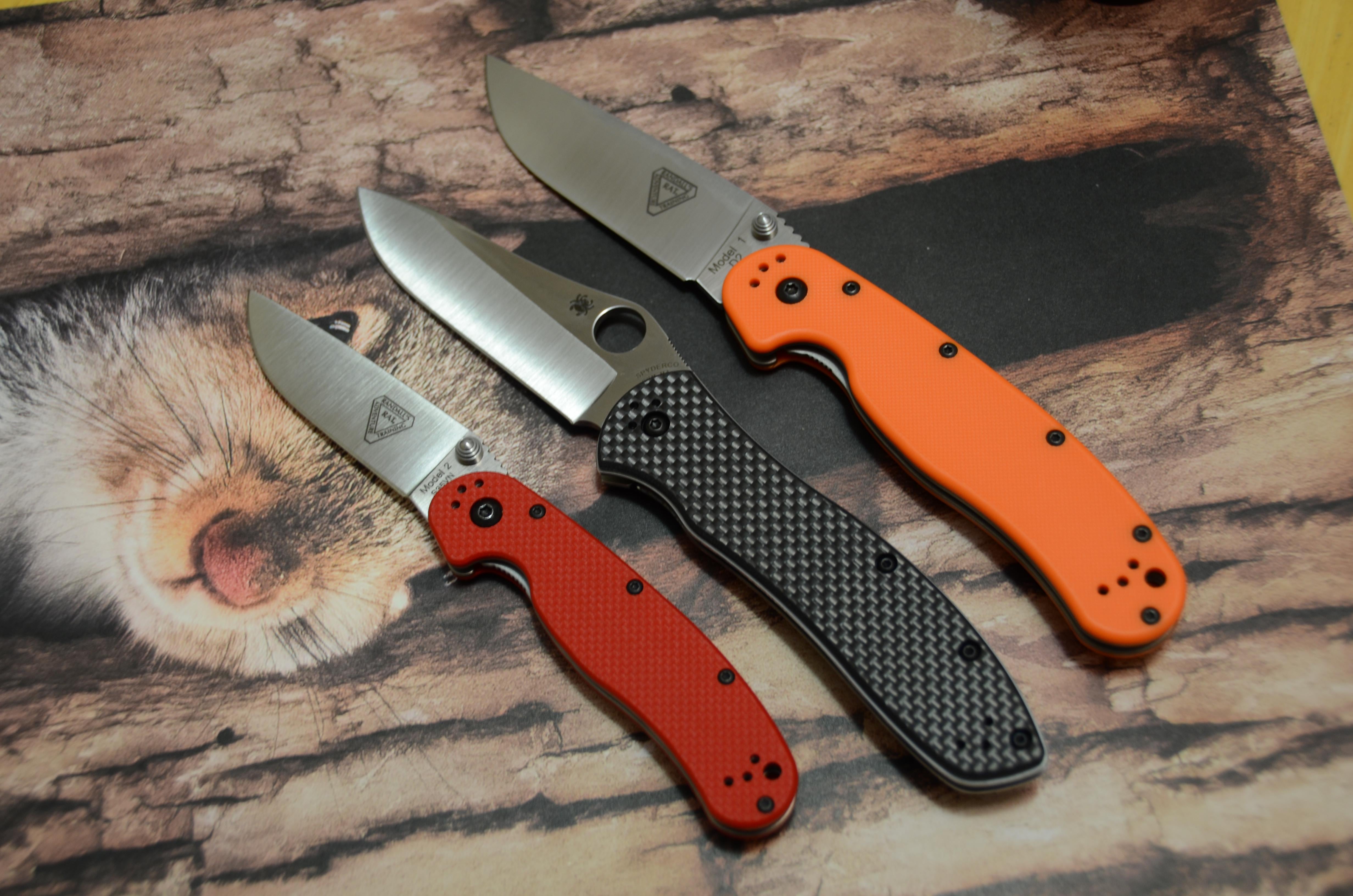 Ontario RAT 1 (orange), Ontario RAT 2 (red), Spyderco Gayle Bradley 2 (carbon fiber)