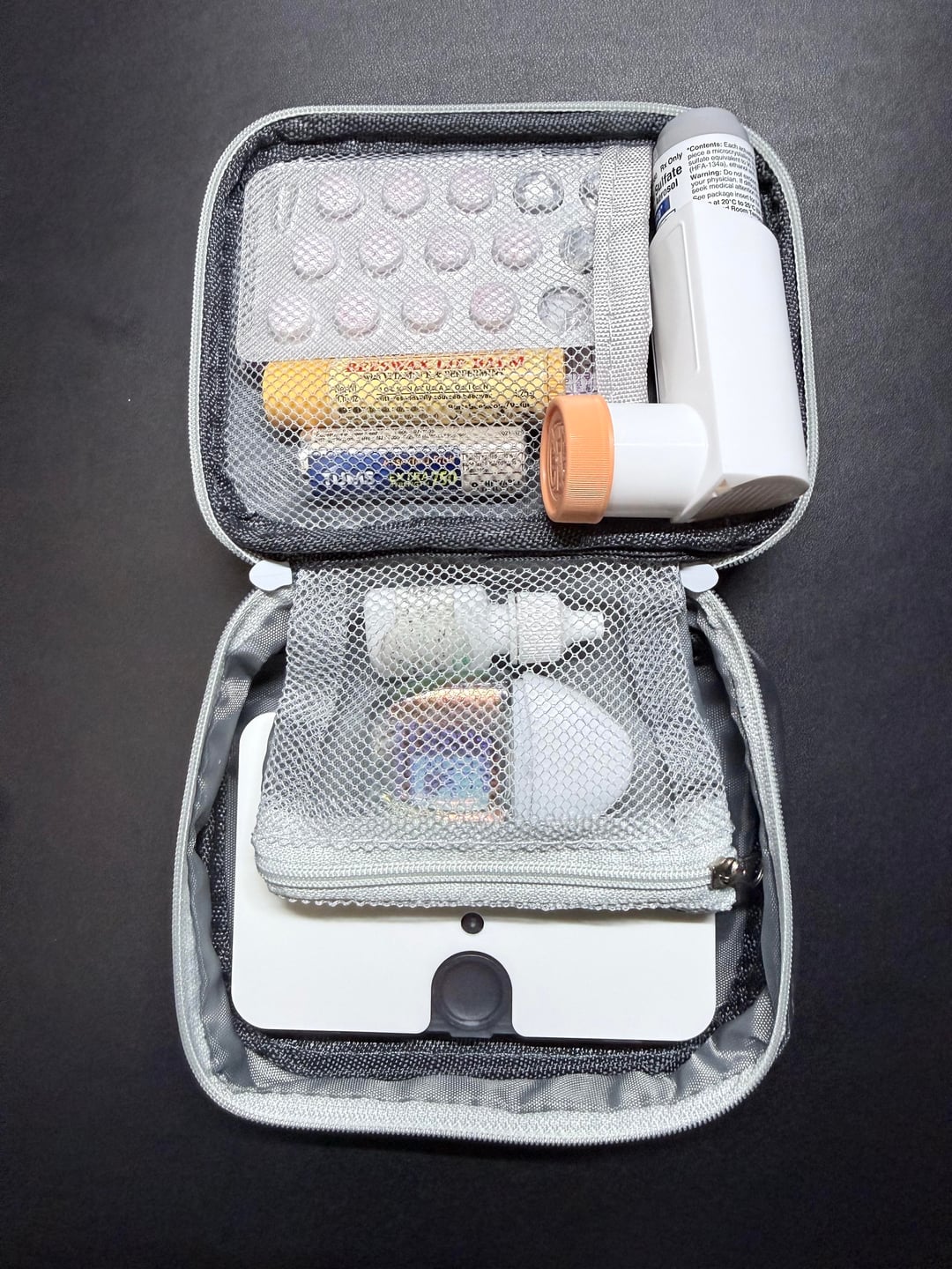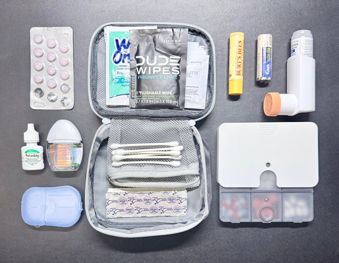 -Personal Medical kit (Contents: Sambucol Elderberry Pills, Pataday allergy eyedrops, Rohto Optic Glow Eye Lubricant, travel soap paper, selection of moistened wipes, Q-Tips, Bandages, extra Burts Bees chapstick, Tums, Albuterol Inhaler, travel pill organizer case (carries 6 different pills: Tylenol, Advil, Aleve, Zyrtec, Sumatriptan Prescribed Migraine Medication, & Exedrin)