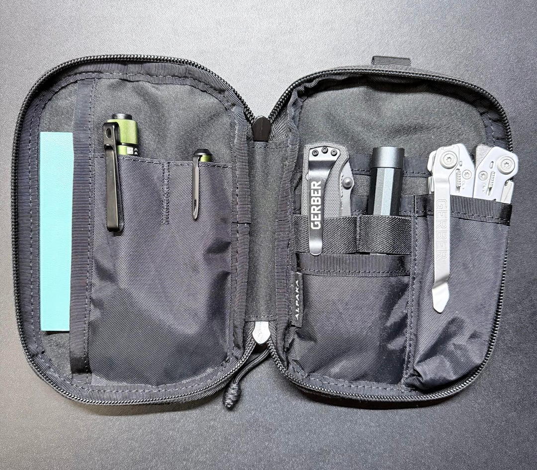 -ALPAKA Admin Pouch Pro in Black in X-PAC (Contents: Moleskine mini notebook, OLight I3T 2 EOS flashlight, OLight bolt action O’Pen Mini 2, Gerber Air Ranger pocket knife, HOTO multi bit mini screwdriver, Gerber Suspension NXT multi tool, Nail Cutter, Token.