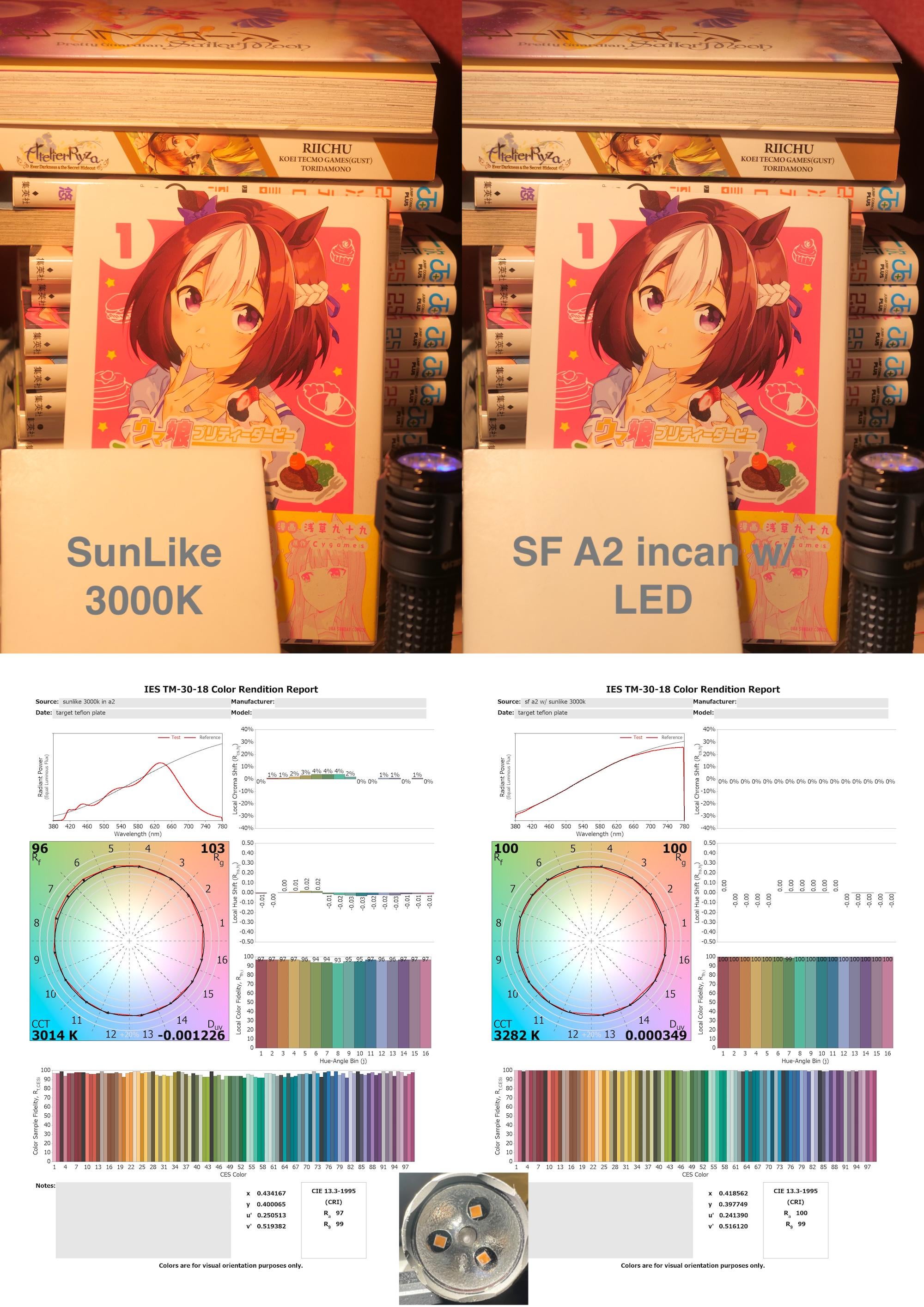 The SF A2 always has the LED on if the main beam is on so measurements/photo is slightly "distorted", the A2 runs the incan at a lovely 3300K CCT.