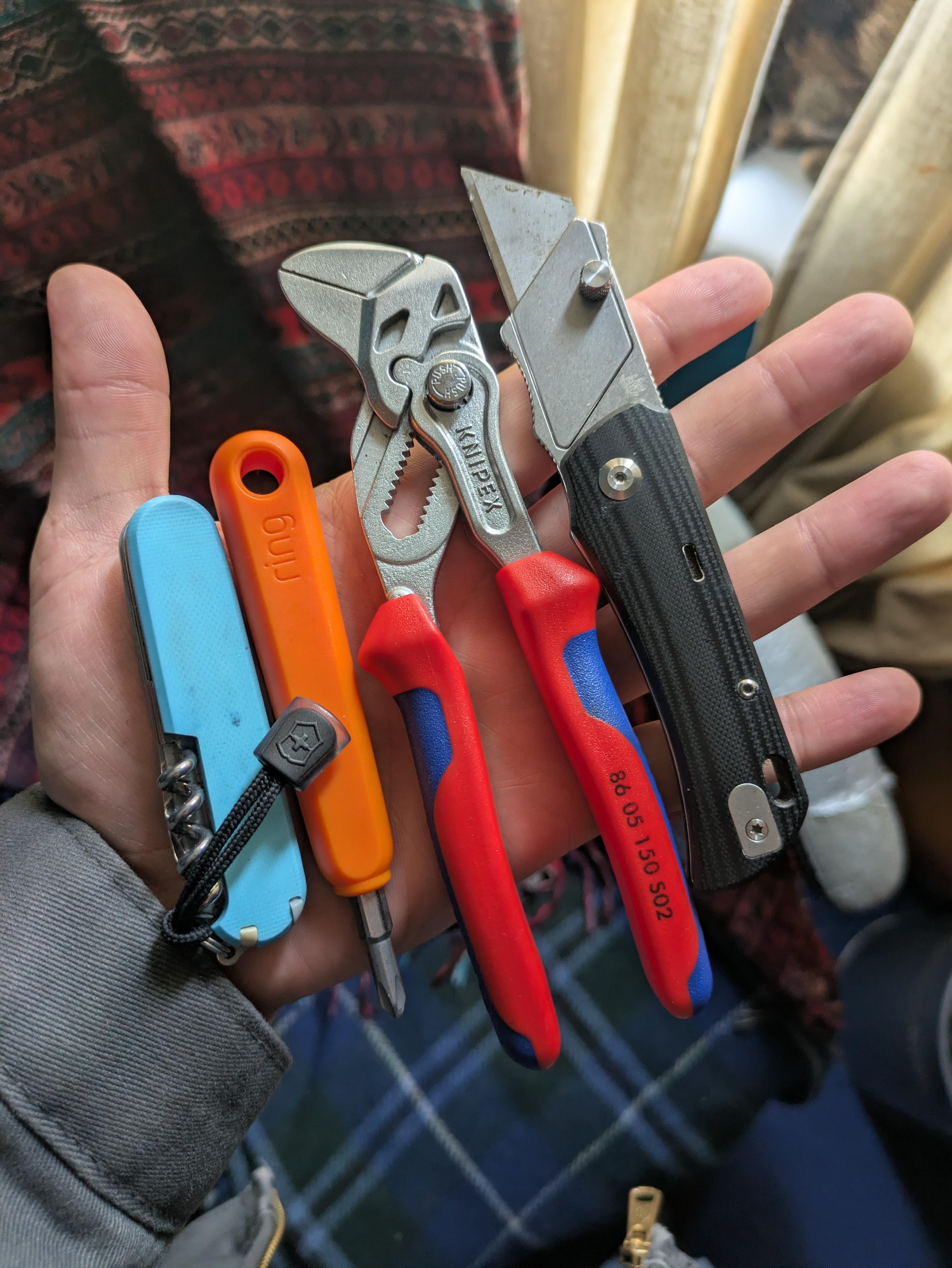 In EDC Tools I carry when I’m not at work March 24, 2026 Victorinox sportsmanRing camera screwdriverKnipex parallel gripsTwisted Assisted PallasI've been rotating between a few slipjoints in my coin pocket, along with the Pallas, which has been my true EDC for several months.by HoldenHiscock69 EDC Prev Post Halo IV Bronzed Apocalyptic Clip Point March 24, 2026 Next Post NLD! ACEBEAM TERMINATOR M1 March 24, 2026 Related Posts Sat. Pocket Dump March 28, 2026 Got the ol’ trusty brass carry for a weekend out at the cabin. March 28, 2026 Saturday edc March 28, 2026 1 Comment AutoModerator 4 days ago Thank you for posting to r/EDC! Include a detailed item list (make/model) within **1 hour** of submission. Lists can go in the title, a comment, or the image. Posts without lists will be removed. If you have already provided a list, not further action is needed, thanks | [FAQ](https://www.reddit.com/r/EDC/wiki/faq)*I am a bot, and this action was performed automatically. Please [contact the moderators of this subreddit](/message/compose/?to=/r/EDC) if you have any questions or concerns.*Write A CommentYou must be logged in to post a comment.