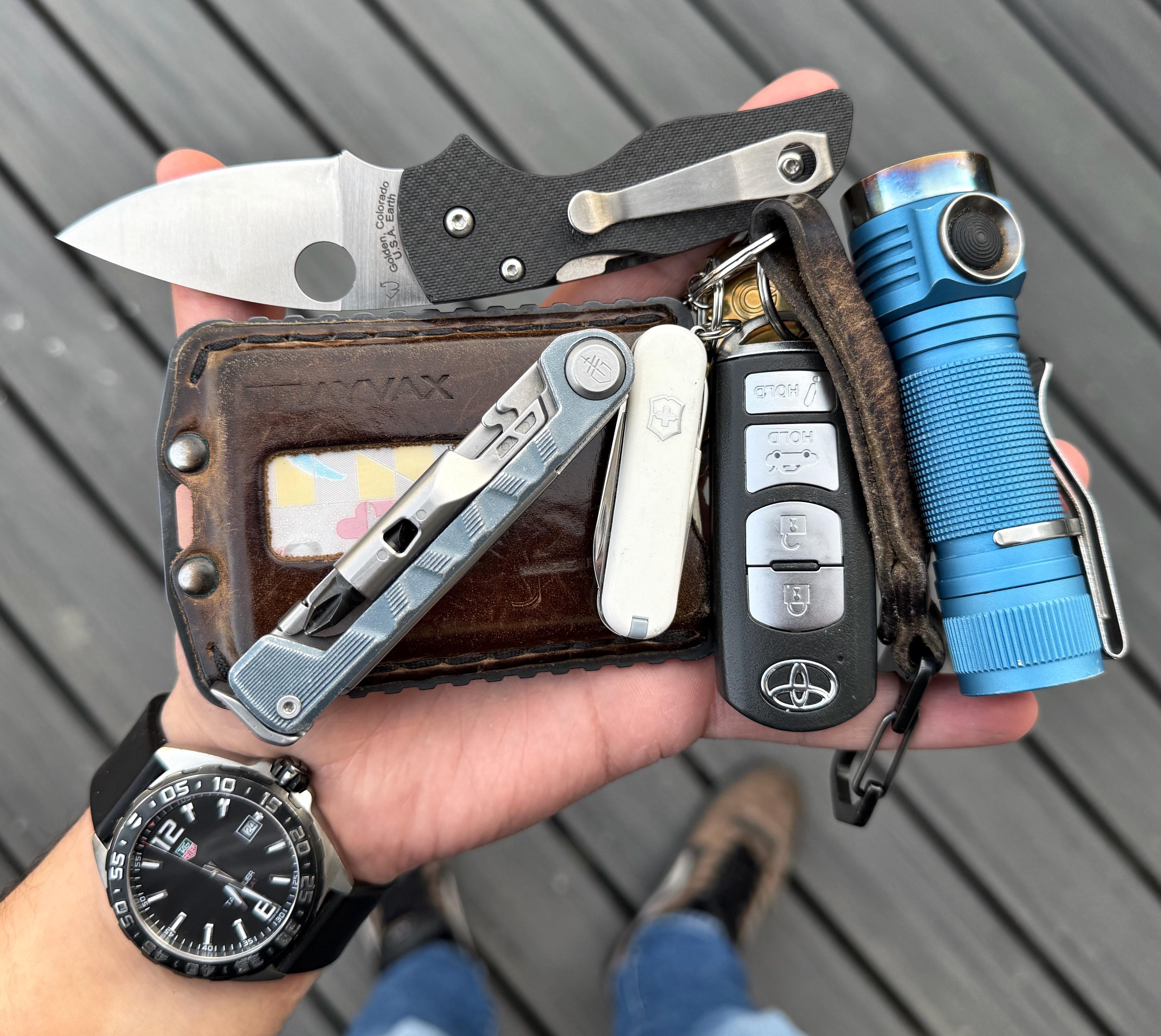 Items: Spyderco Lil Native, Trayvax Ascent wallet and keychain, SAK Classic, Emisar D4V2 with E21a LEDs, Gerber Armbar, Tag Heuer Formula 1