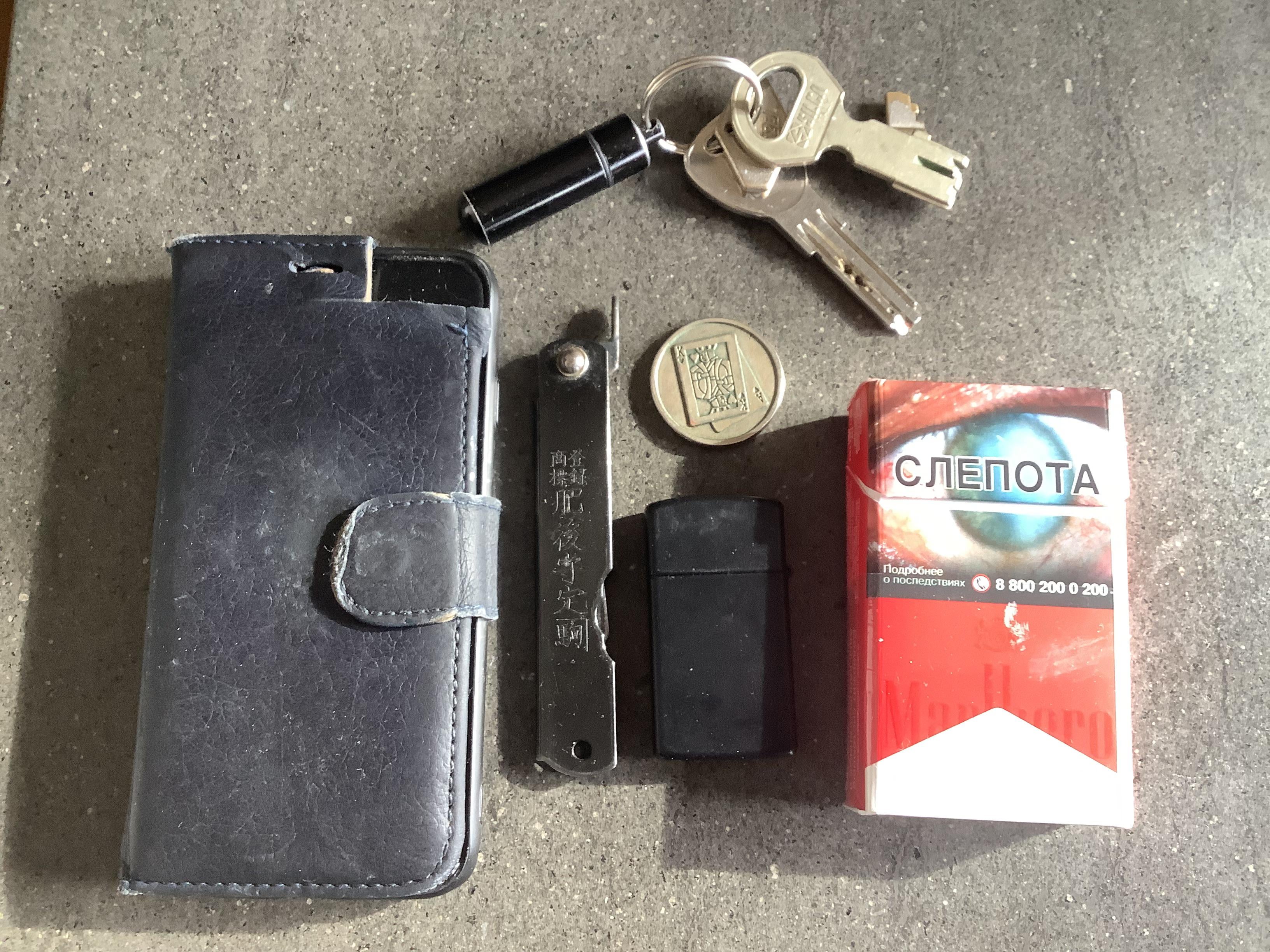 iPhone number smth with id, credit card, and 200 dollars cash. Keys and small container for mandatory medicine. Higonokami knife, small. Zippo, small. Random vegas lucky coin for heads and tail. Cigarettes (until I finally manage to stop.)