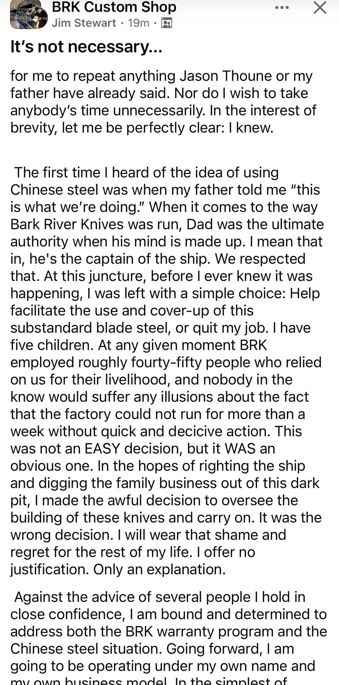 In KNIVES Jim Stewart (Mike Stewart’s son) Response March 25, 2026 Jim Stewart (Mike Stewart’s son) Response by WormedOut KnifeKnives Prev Post Mailman was good to me March 25, 2026 Next Post Custom Golf Divot tool blades March 25, 2026 Related Posts Knife collection 😂 March 27, 2026 Mora Companion S March 27, 2026 SOTC- these made the cut March 27, 2026 5 Comments 816blackout 2 days ago Damn. Imagine doing that to your own son. Imagine your dad doing that to you. Shitty situation for him. TheR4alVendetta 2 days ago No dog in the fight but I’m not buying knives from anyone involved in this dumpster fire. InfamousAd5088 2 days ago Lmao! ILikeKnives1337 2 days ago I wonder how many people support a family of five kids while making far less money than he did stealing from customers. InfamousAd5088 2 days ago ESHWrite A CommentYou must be logged in to post a comment.
