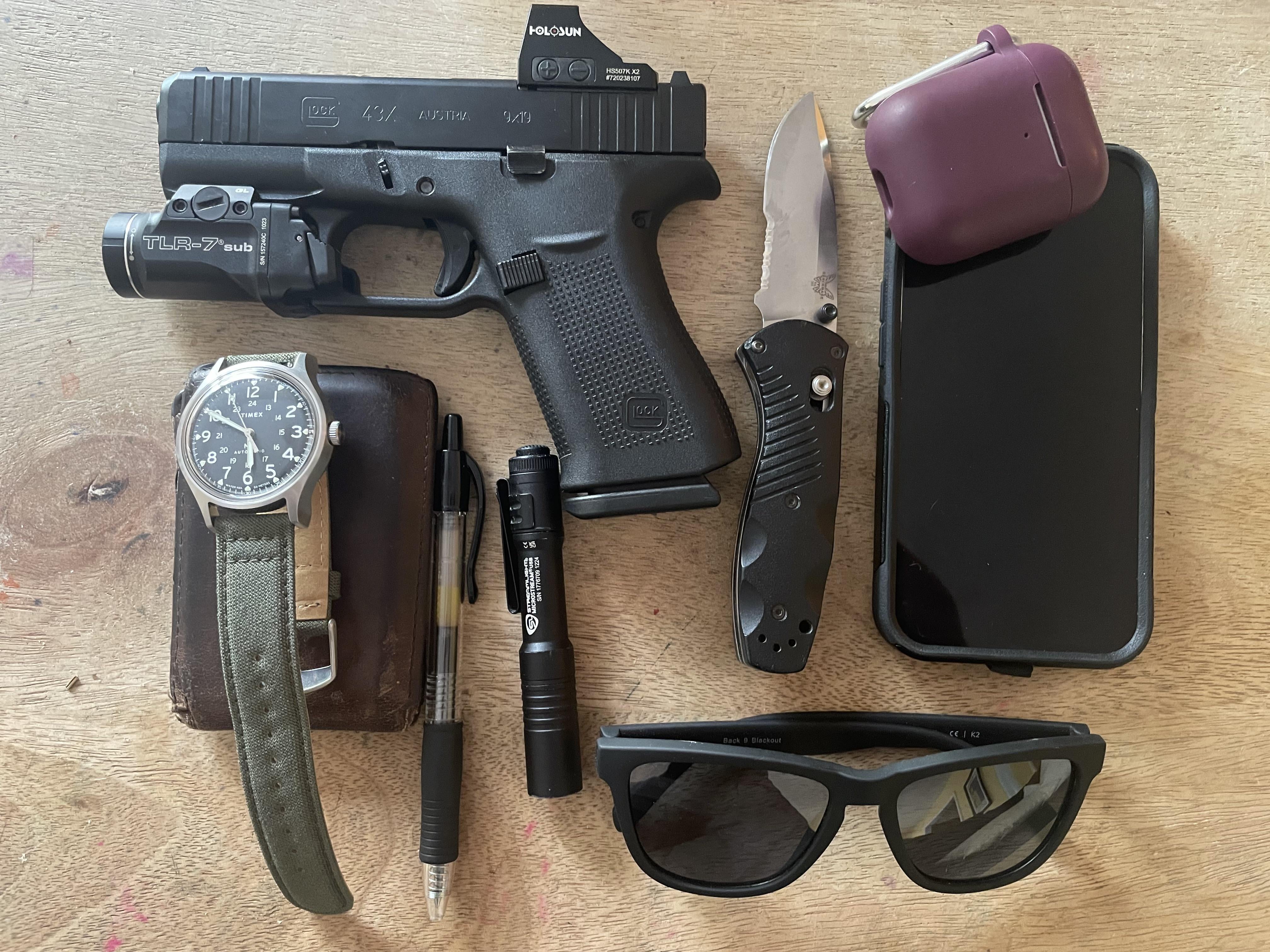 Timex MK1 Auto, 23 yr old Fossil leather wallet w/ perfect butt mold, Pilot G2, Streamlight Microstream, Benchmade Mini Barrage, iPhone, iPods, Goodrs, Glock 43X, Tight Chutes Voyager Sport (not pictured). Boom