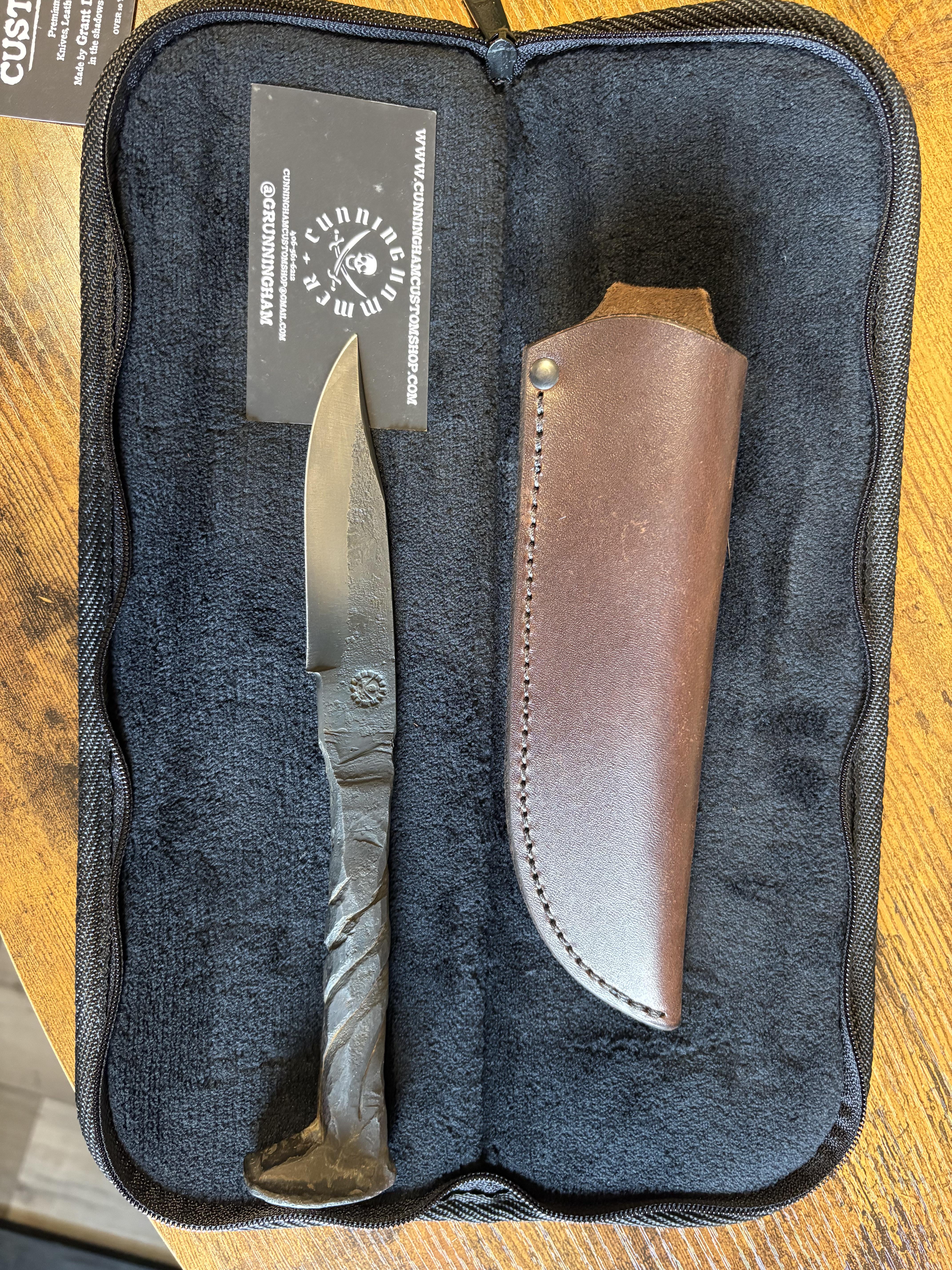 I saw this knife maker Grant from Cunningham Custom Shop showing off railroad spike knives his students made in his shop. I commented that I always wanted one, and he tells me to PM him. So I do. We work out the details and I paid a deposit. A few days later he sends pics of this knife he made and I happily send my shipping address. Come to find out we live in the same city in Oregon! I had no idea at all, nor did he, and we were both shocked! what are the chances? I drove out to his shop today and brought him some of my home made cheese and he gave me a tour of the shop. Just the nicest guy you ever want to meet. It was a lot of fun and he is clearly passionate about what he does. He showed me his finished knives and they are works of art. Truly. Anyway, just a blast meeting him and seeing his work first hand. I ordered a proper knife from him and took this baby home.