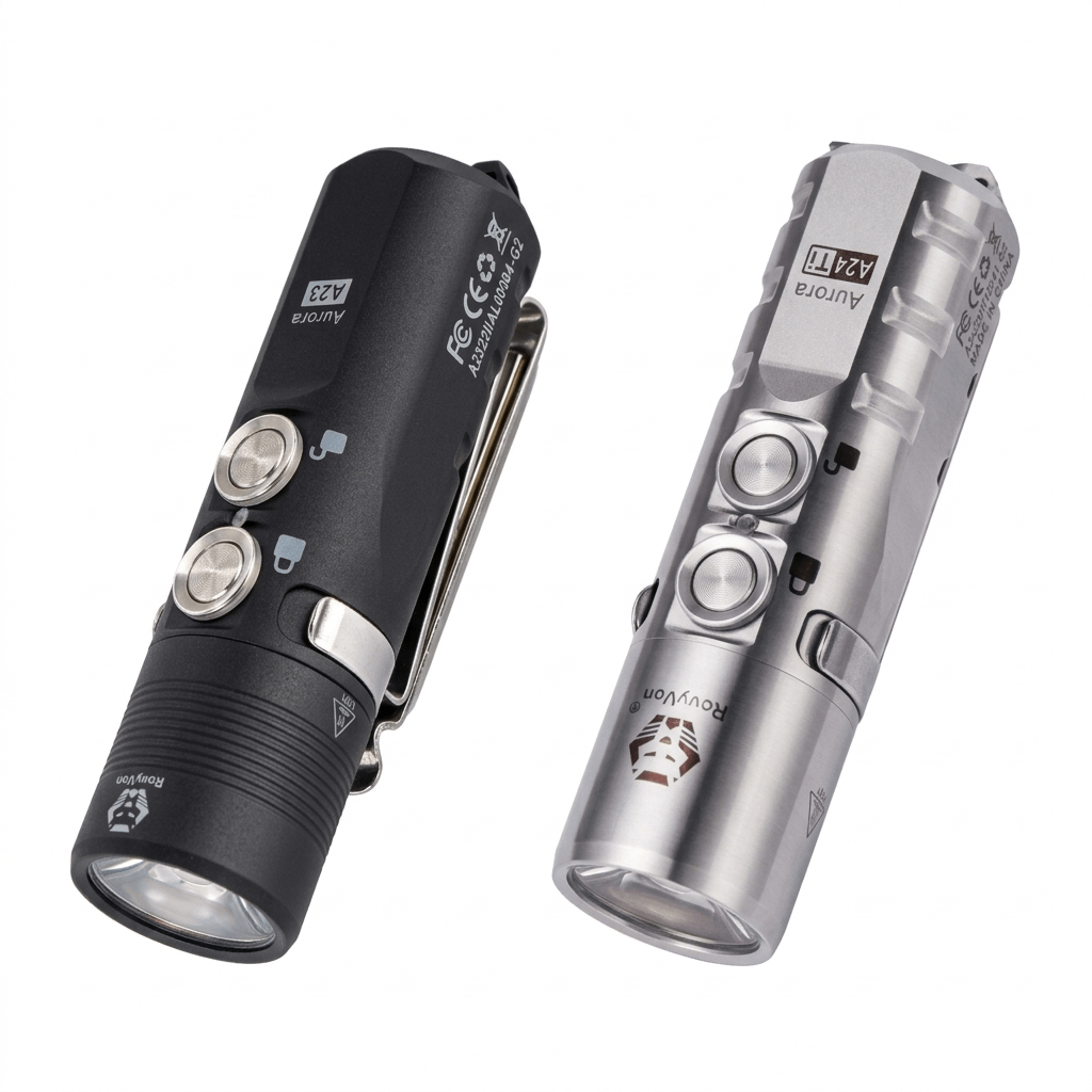 If you guys have to choose one, which one do you choose? Right now, the A23 is costing $34.95 and the A24 $81.95. I know that at the end of the day, they are the same flashlight, but the difference is the material. Is the titanium worth more? Or is the aluminum just enough? Which one will be more durable? My goal is to put on my keychain and forget. I don't think I'm going to use it a lot, but more when I need it, and it will be part of my daily EDC. I want something that lasts me a long time, and if the batteries get bad, I can also change the batteries (Rovyvon sells replacement batteries). I want to know your opinions and experiences about these models and materials.