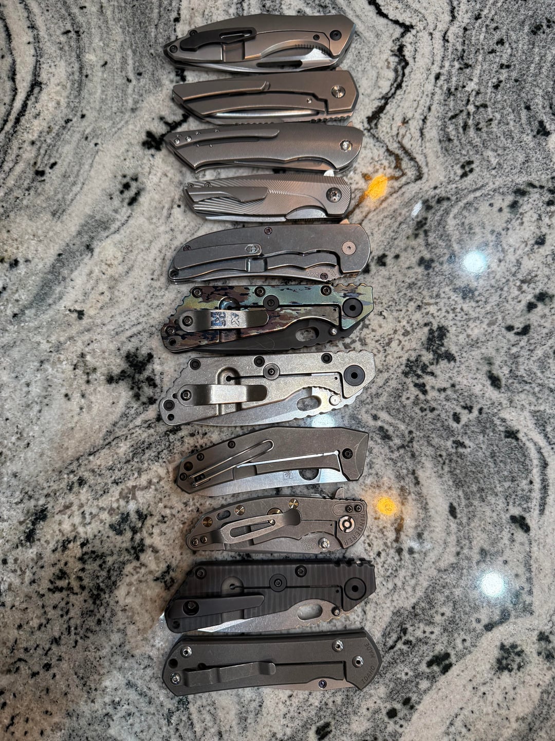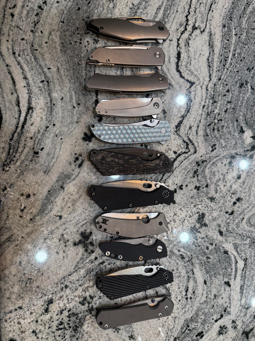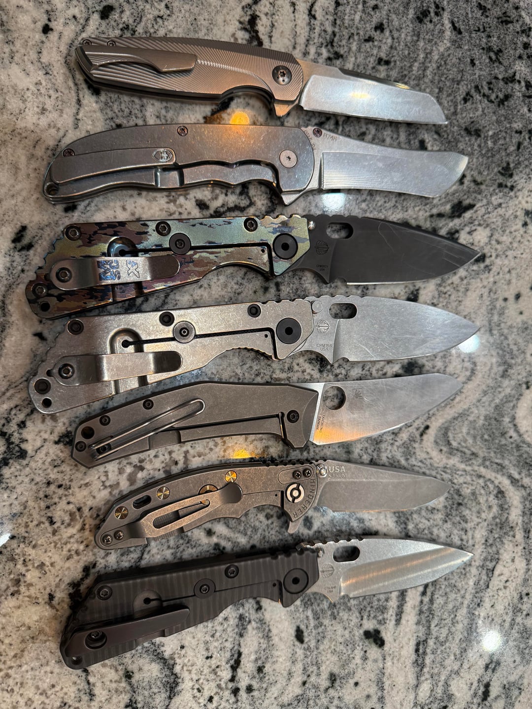 At number 3, the Slim is wickedly comfortable in the hand, although not better than the Koenig. The action on this knife is so fast, pressure on the flipper and you get lots of detent, then boom the knife is open and singing at you in standard Herman fashion. I’m not sure if it’s the detent design, pivot/lockup geometry or simply just this knife, that causes it to pivot open so quickly, but I love it. A few of my coworkers even asked if the slim was spring assisted due to how quick it is. Both of these knives have very thin blades, especially the Mojave, and they are awesome. I didn’t realize till recently how long I have gone in my collection without something that slices this well. As far as geometry is concerned (with my limited experience) these two perform much much better than my spydiechef and my pm2, which are very nice slicers imo.
