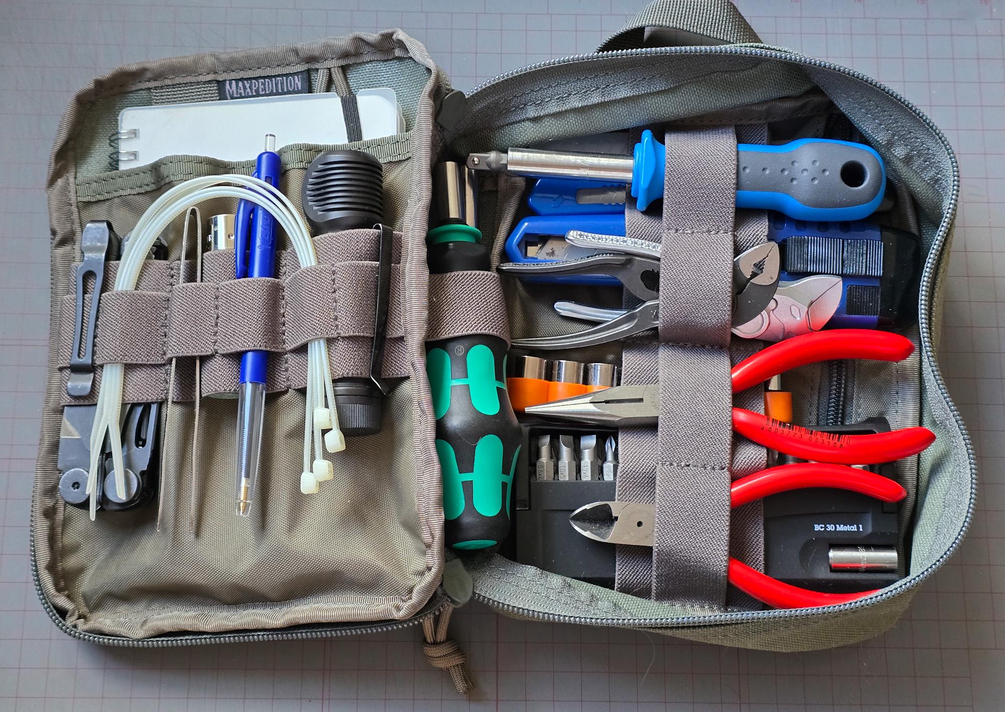 Maxpedition pouch, multitool (not necessarily needed but had plenty space left), tweezer, lighter, pen, flashlight, tierips, blocnote, combi driver with built-in cartridge, bit extension, bit holder, cobra xs and mini wrench plier, needle nose plier, diagonal cutter, utility knives, set of sockets and 30 bits cartridge.