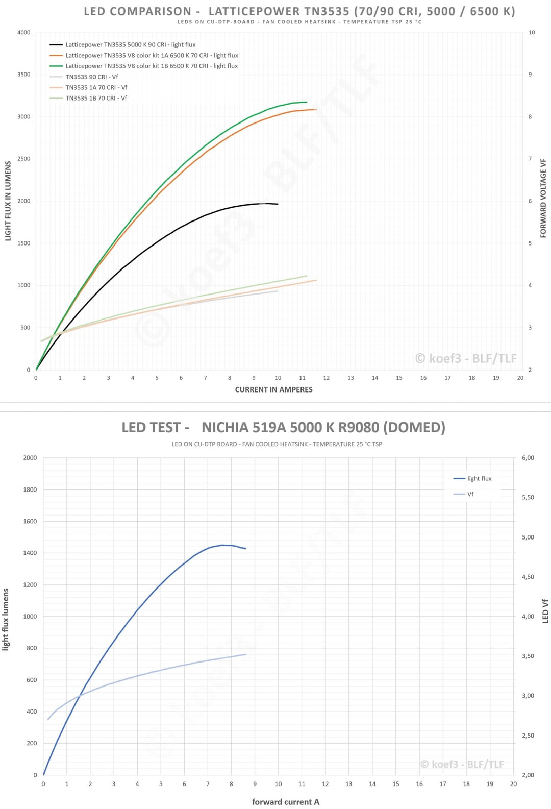 I was initially contemplating 519a emitters, but their Vf is substantially lower than TN3535 (see the 3rd picture; graphs taken from koef3’s reviews). As the emitters are connected in series here, I was concerned about potential over-driving them, so I gave up this scenario.