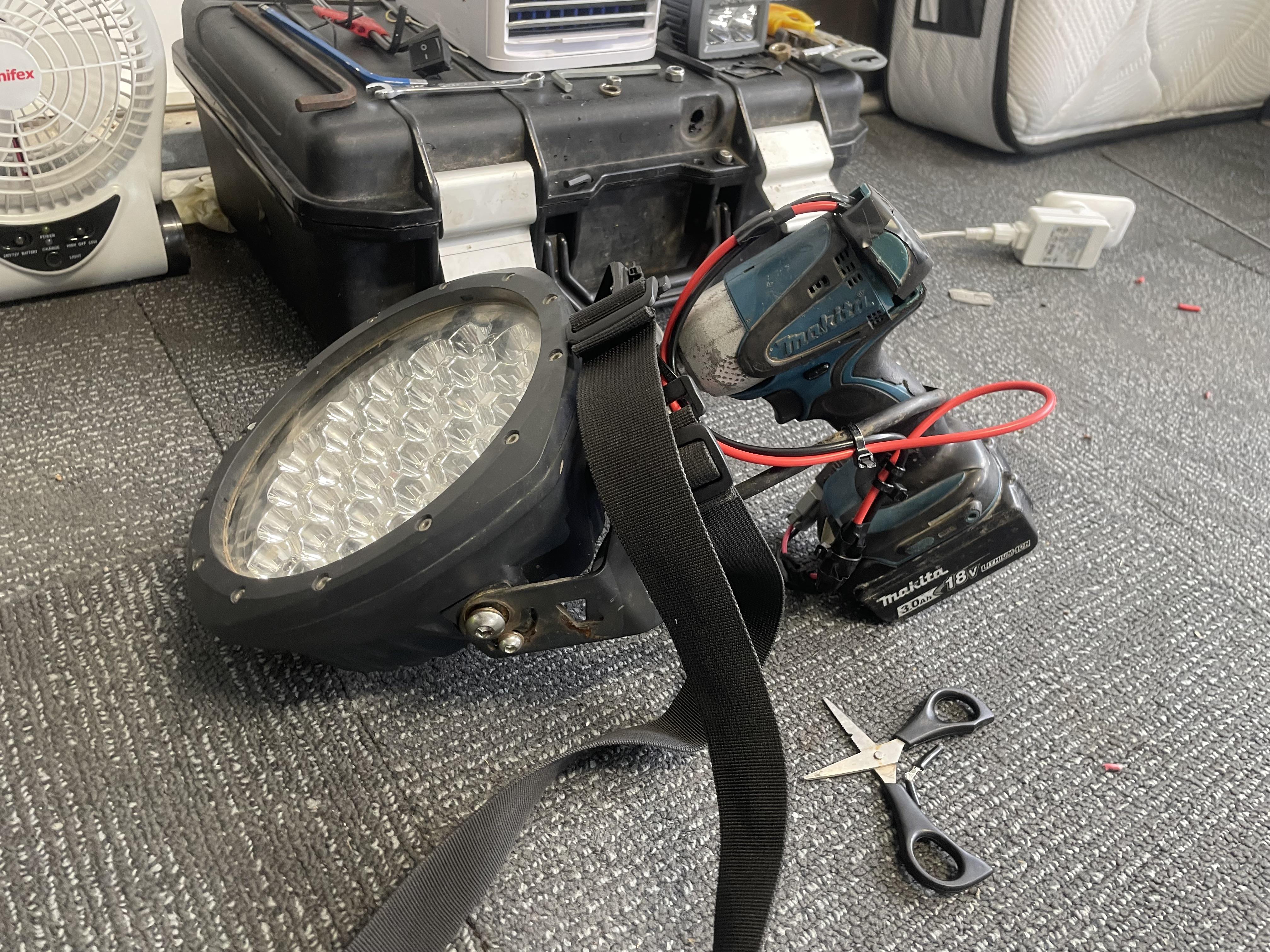 It uses an old Makita drill and 3.0ah 18v LXT Battery and a 7 Inch Adventure Kings Illuminator