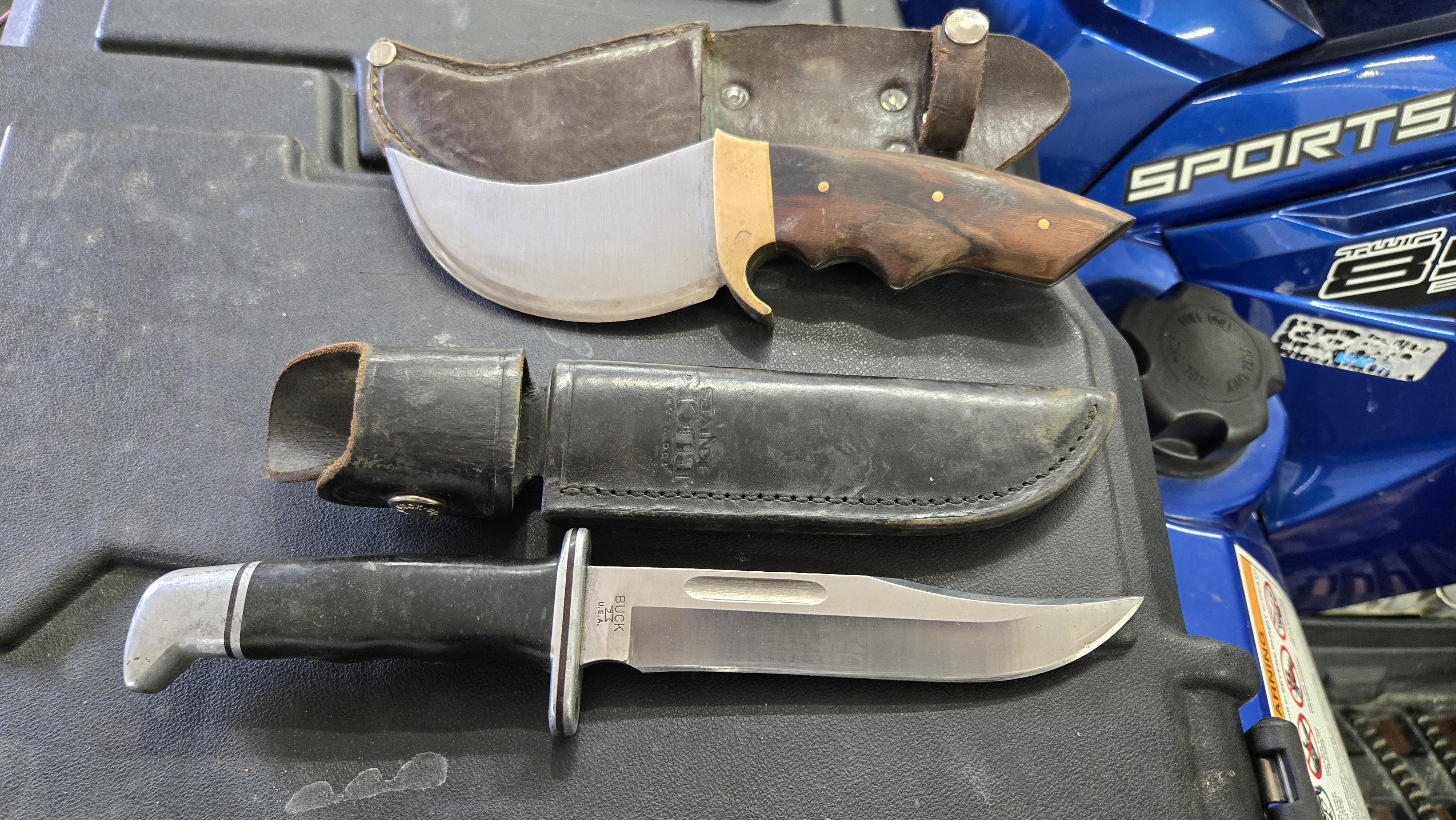 My one and only attempt at knife making from back in 1986. It is a full tang skinner made from a then, 60-year-old sawmill blade that my Grandpa had. It took me about 4 months to make in my spare time. It has peeled the hides off of dozens of carcasses. Still holds an edge better than any other blade I have. The other, is a 100-year anniversary Buck, gifted to me by my brother. It has also helped put a lot of meat on the table. These are neither modern nor flashy and not necessarily porn. They are utility, as they should be. Cheers