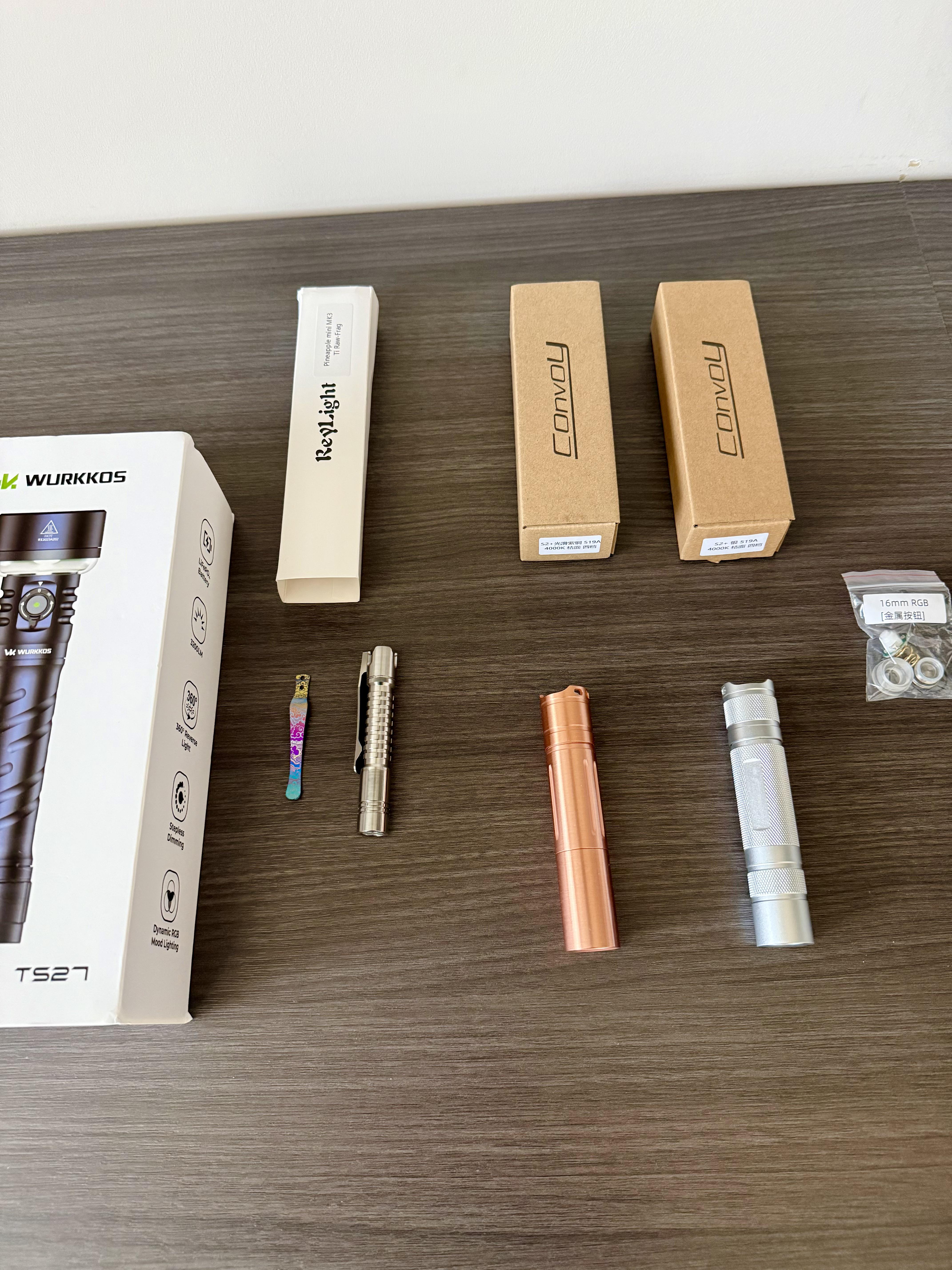 TS27, Reylight Ti Raw-Frag with multicolor Ti clip, Convoy S2+, a copper and silver. And a metal light switch 16mm with adapter, hoping it will fit the Copper S2+.