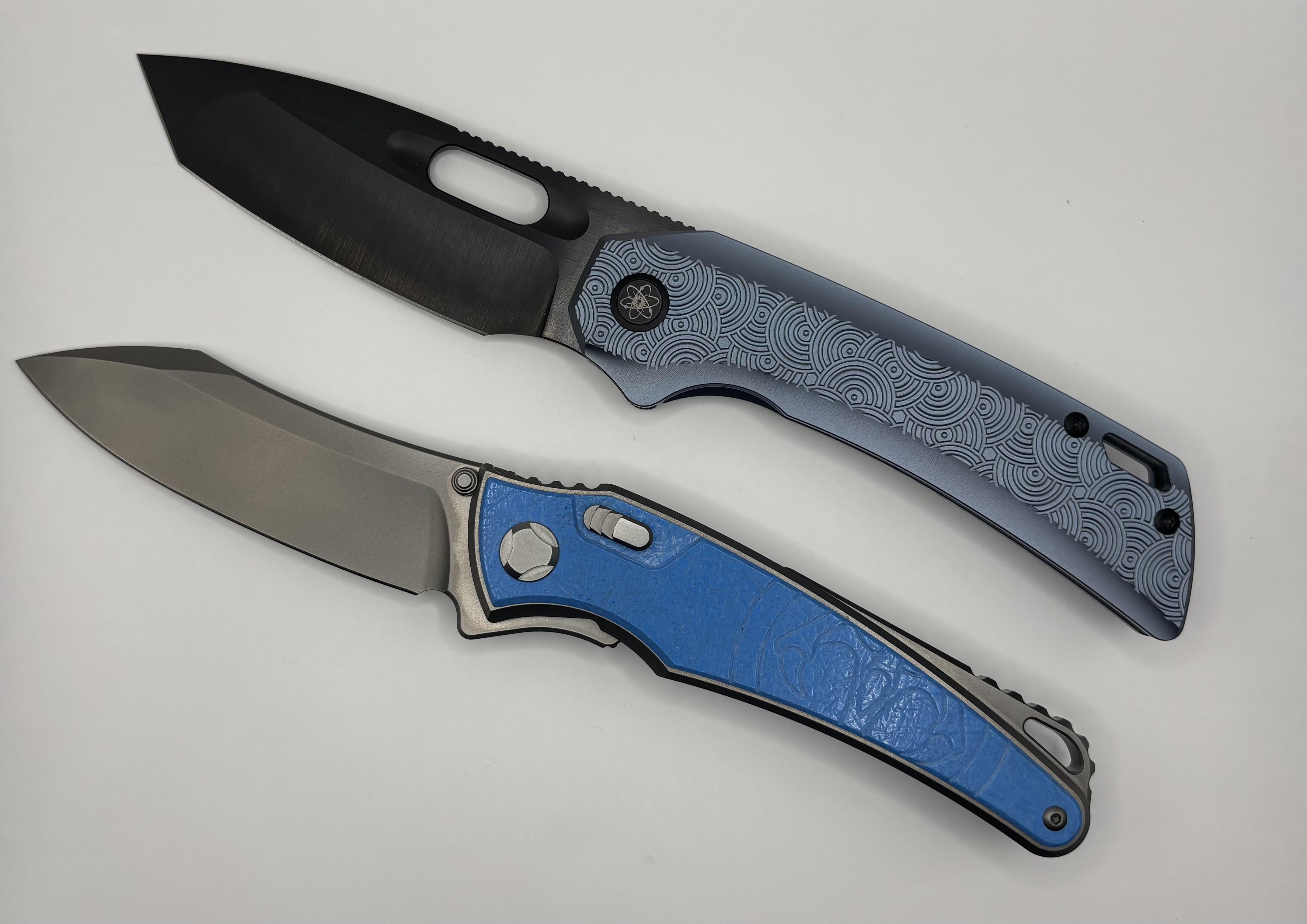 Top: Nymble XT – Urban EDC exclusive – Black DLC blade with blue anodized w/ Chaos Seigaiha milling pattern.