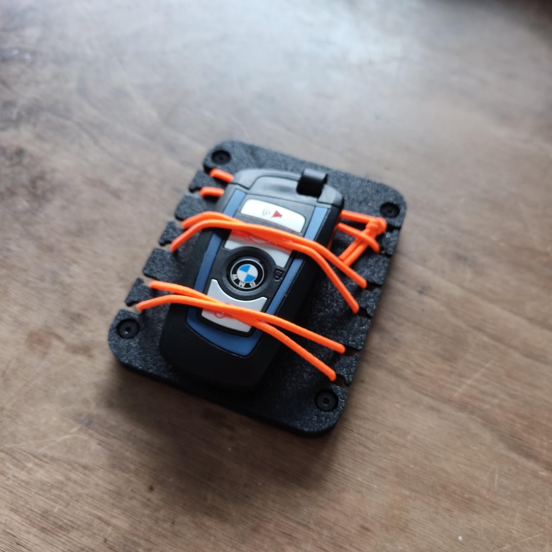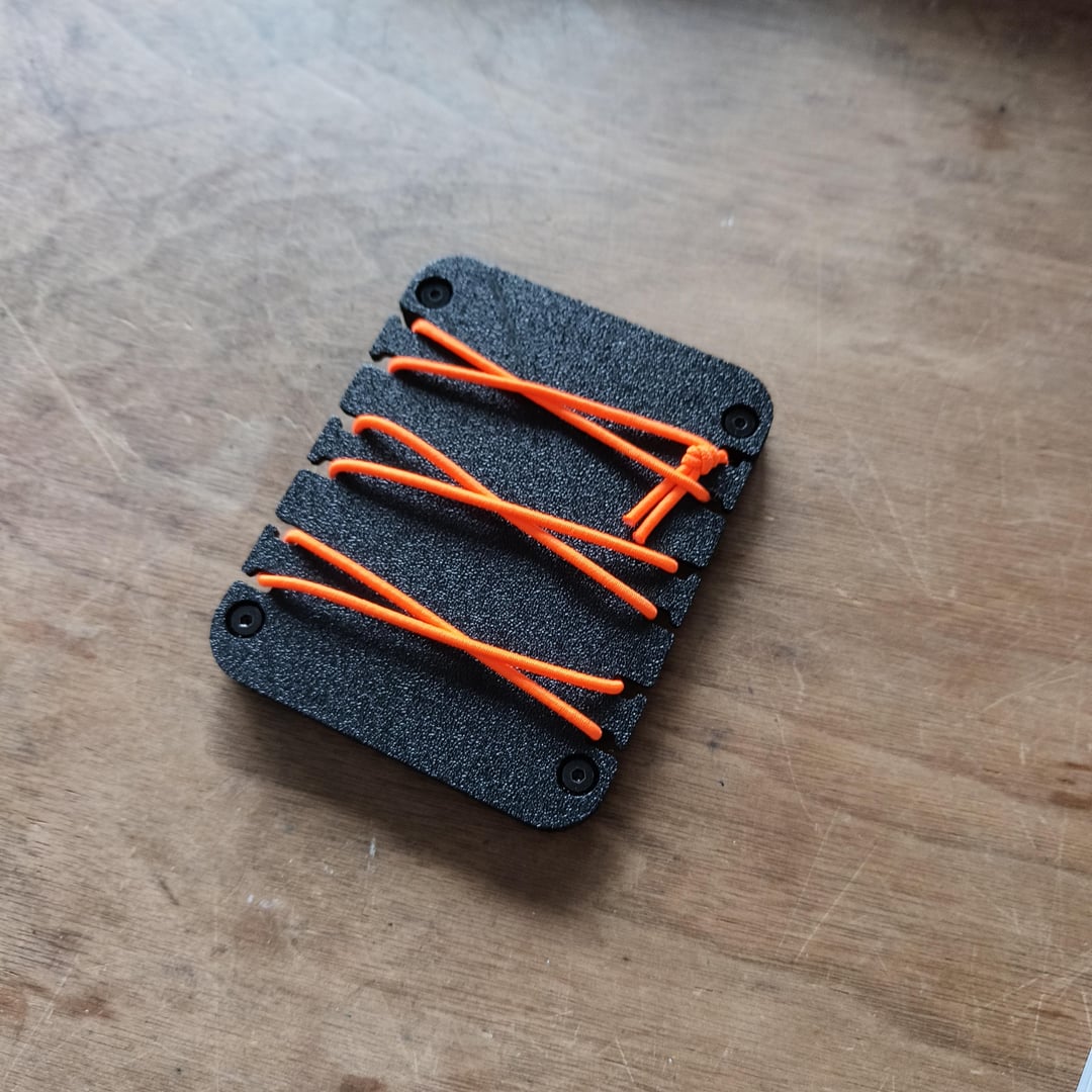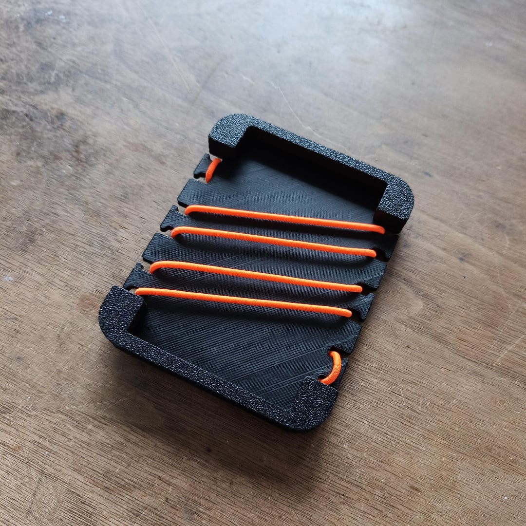 I recently switched away from a Samsung phone so my Samsung tag no longer worked. I took the opportunity to update my carry. It's printed in 3 parts, using M3 heatset inserts and screps so I can adjust the height for the cards. It uses 2mm orange bungee and a strip of Pulsar SuperGrip on the back of the key to stop it from moving. I plan on getting a small poket knife to add to this, if anyone has suggestions. I replaced the Samsung tag with a Reyke Smartcard.