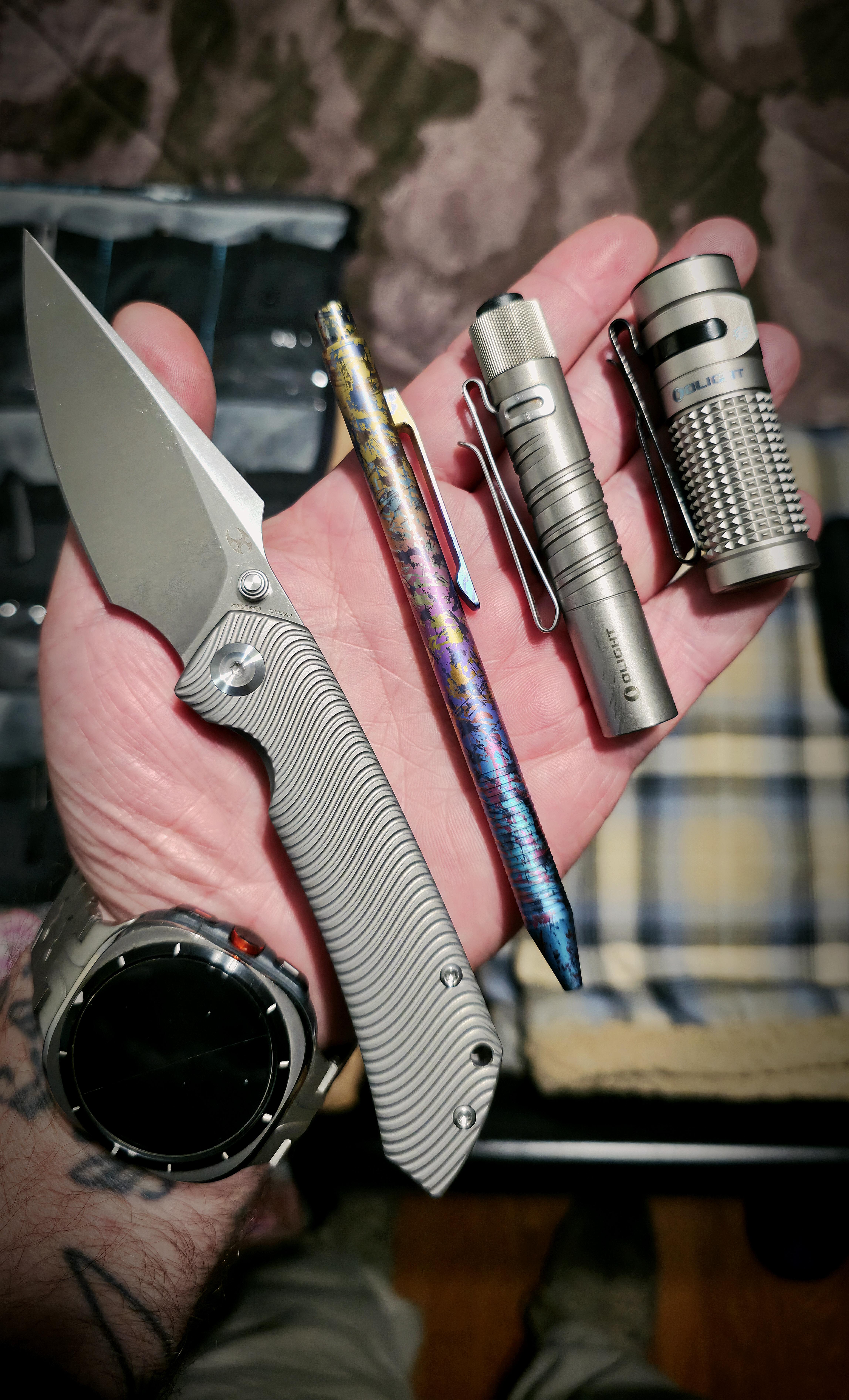 Todays EDC is the Samsung Ultra watch, framelock Kansept Fenrir, Katuo pen, Olight i3T and Baton 4