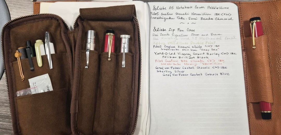 Keeping it light. Pen case, notebook, earbuds, and pen holder. Pen case and A5 notebook cover are &Liebe brown pebble nume leather. bronze crab penholder is from coppertist.wu.
