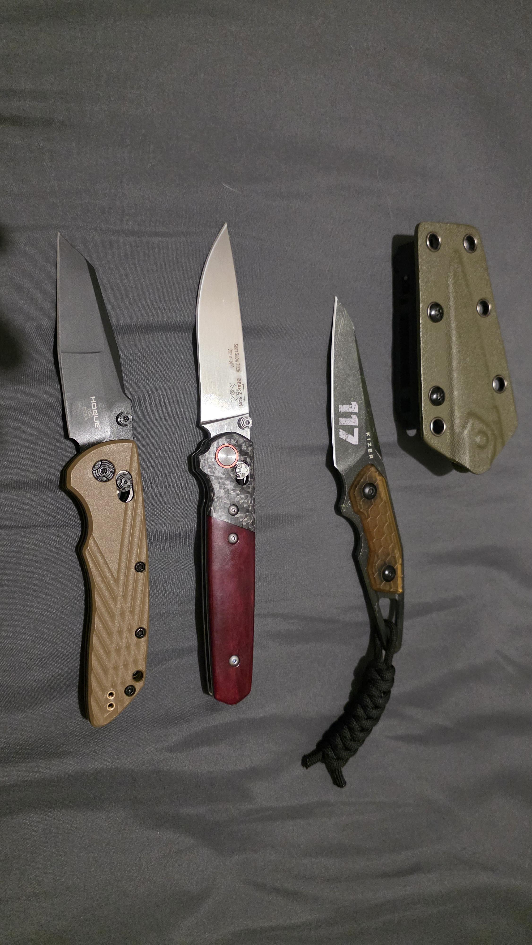 got the kizer about a month ago and I have carried it every day since. I'm not a fix blade person I have a couple but there big and the sheaths are either nylon or cheap leather. i have some cheap plastic sheath fixed blades from Walmart. But they're not the best quality. This is my first kydex and I love the fact that you can just pop it on and off with the clip. its small but you can still get 4 fingers on it. May look at the baby banter next.
