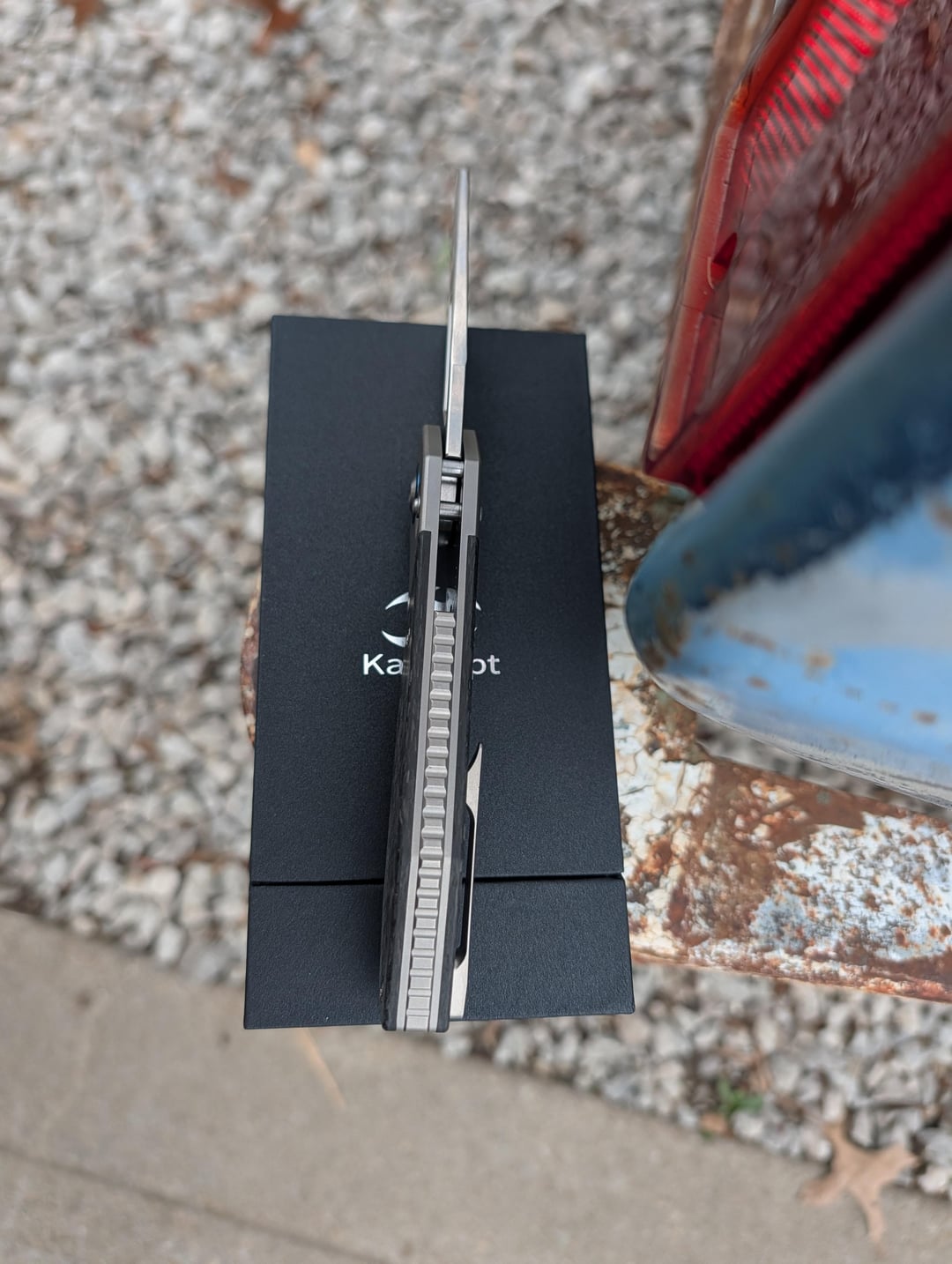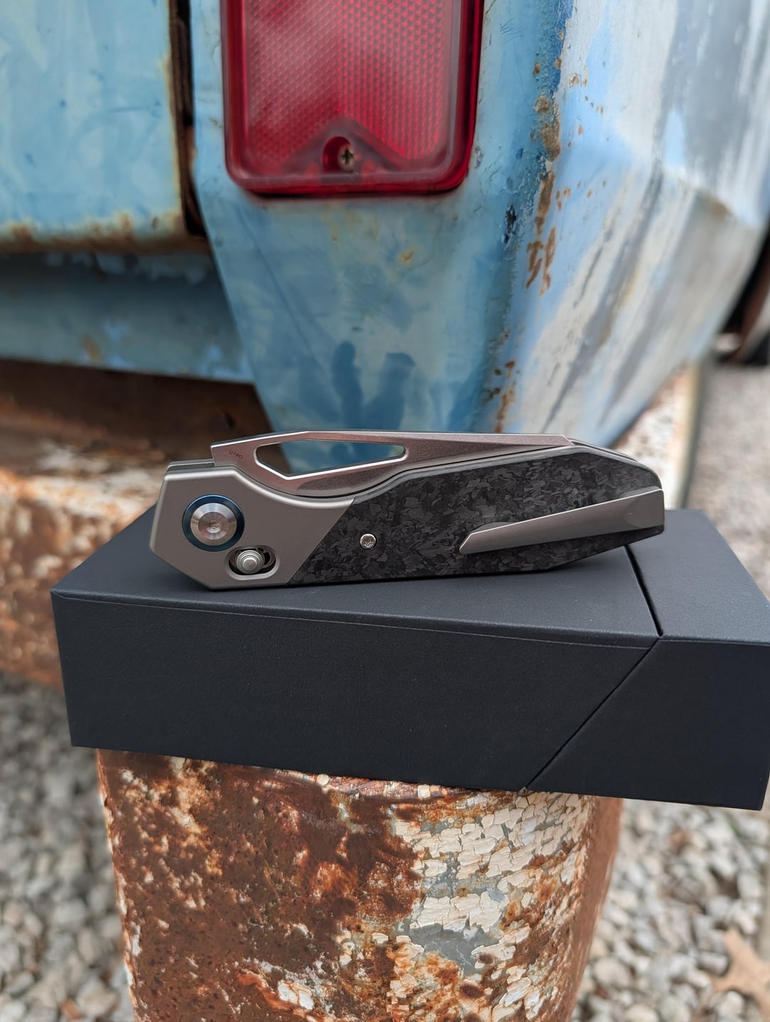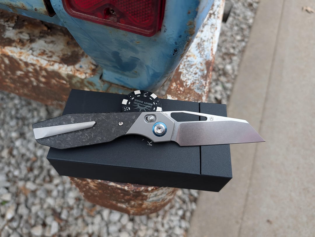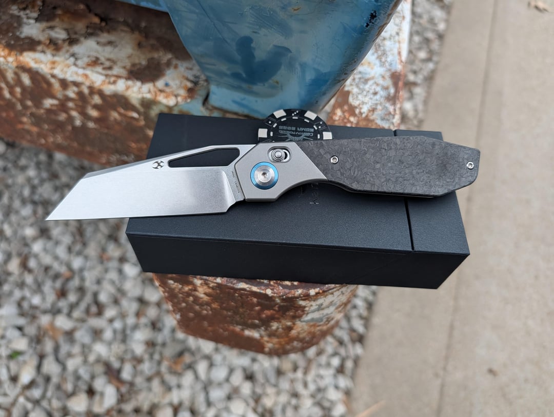 This piece feels like it belongs in a sci-fi cockpit. Luft Concepts designs clean gear, and Kansept's execution on this model is honestly impressive. The Crossbar Lock on this is buttery smooth. Being a Luft design, the geometry is dialed in-you can flick it open with the thumb studs or just pull the lock back and swing it. It's one of those knives you'll find yourself playing with at your desk all day. The blade is Elmax with a stone wash finish. It's tough enough that you don't have to baby it, but it holds an edge way longer than your standard budget steels. The Shred Carbon Fiber inlay against the bead blasted titanium gives it a very custom look without the $600 price tag. The handle is 8.5 inches overall, so even if you have larger hands, you're getting a full, comfortable four-finger grip. They went with an almost full length titanium back spacer that has jimping. I only noticed a couple things I would change. First no lanyard hole or pin and the carbon fiber finishing could be a little more refined around the edges. Overall this is a killer piece that has a premium feel with a budget premium price.