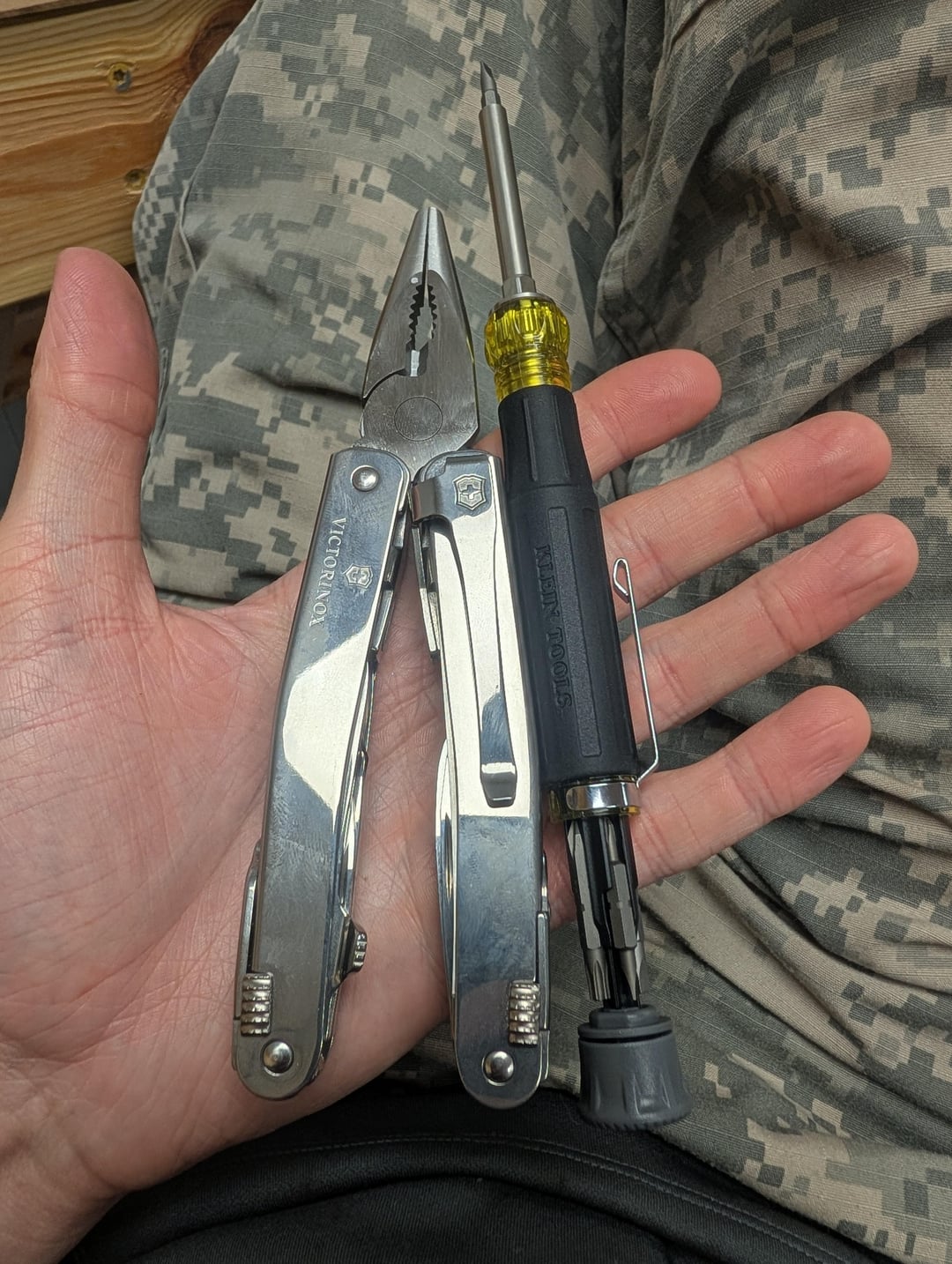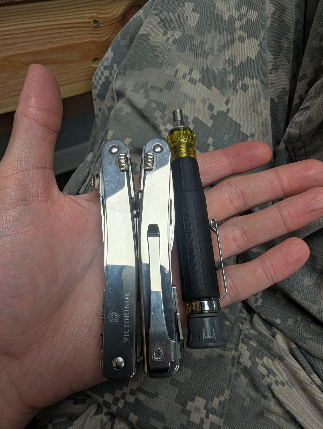 Today I'm carrying my Swisstool Spirit MX Clip, and a Klein 32600P precision driver. The Swisstool is probably my favorite multitool I own, tied with my LM Surge. It has all the tools I want and nothing else, and doesn't require any accessories to run it at its full potential. The Klein adds several bit types and a 1/4in receiver, which really adds a ton of versatility. If I could only carry these two items, I'd be pretty confident I could handle any miscellaneous task short of writing or marking that came my way.