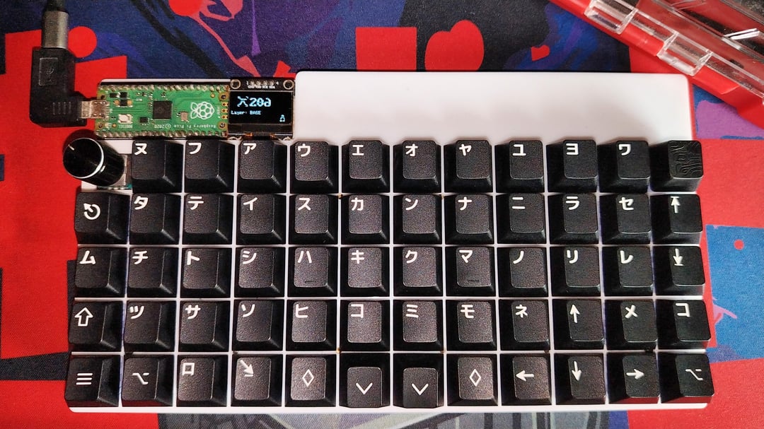 – My custom keyboard I designed and built, I really like the 50% ortholinear format, and I take it to the office and pretty much anywhere else I have to use a computer for more than half an hour. The keycap set is GMK wob katakana, I bought them on sale at Drop