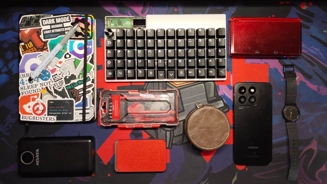 – my Nintendo Switch OLED (also, technically of my brother, but he bought a Switch 2 and let me take the OLED). I don't like the cheap feeling of the joycons bumpers nor the lack of a proper dpad so I bought the mobapad m6 hd, a absolute upgrade in build quality, but since they're much thicker than the joycons, they take up a lot more space in the backpack, which makes me less likely to bring the console with me as often