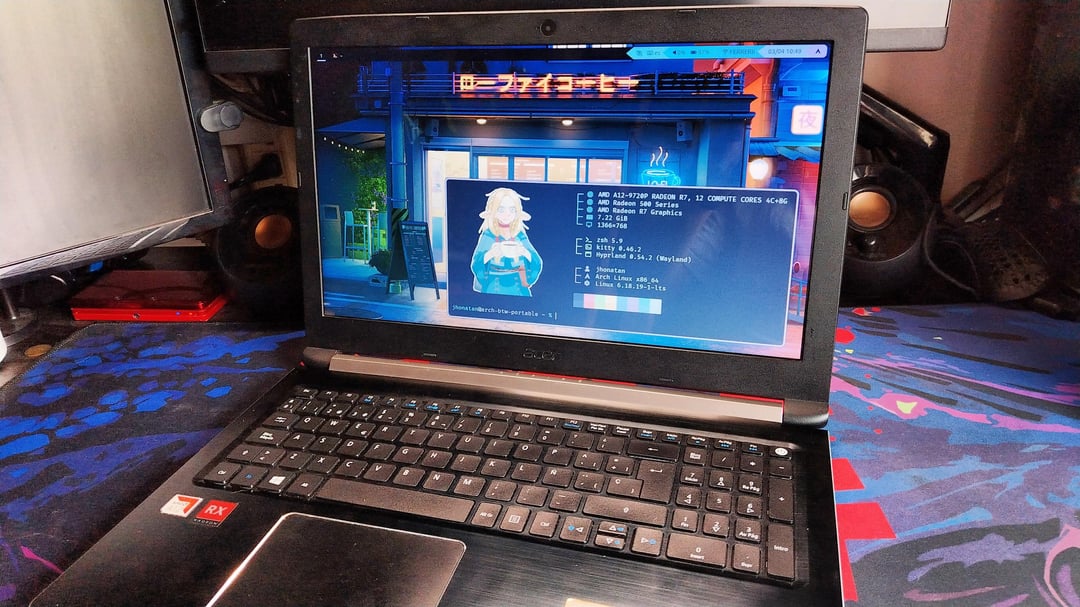 – my laptop, it's an Acer Aspire 5 from 2018, it isn't powerful at all but if works fine for simple tasks like remote desktop or a bit of programming. I have it with Arch Linux, btw