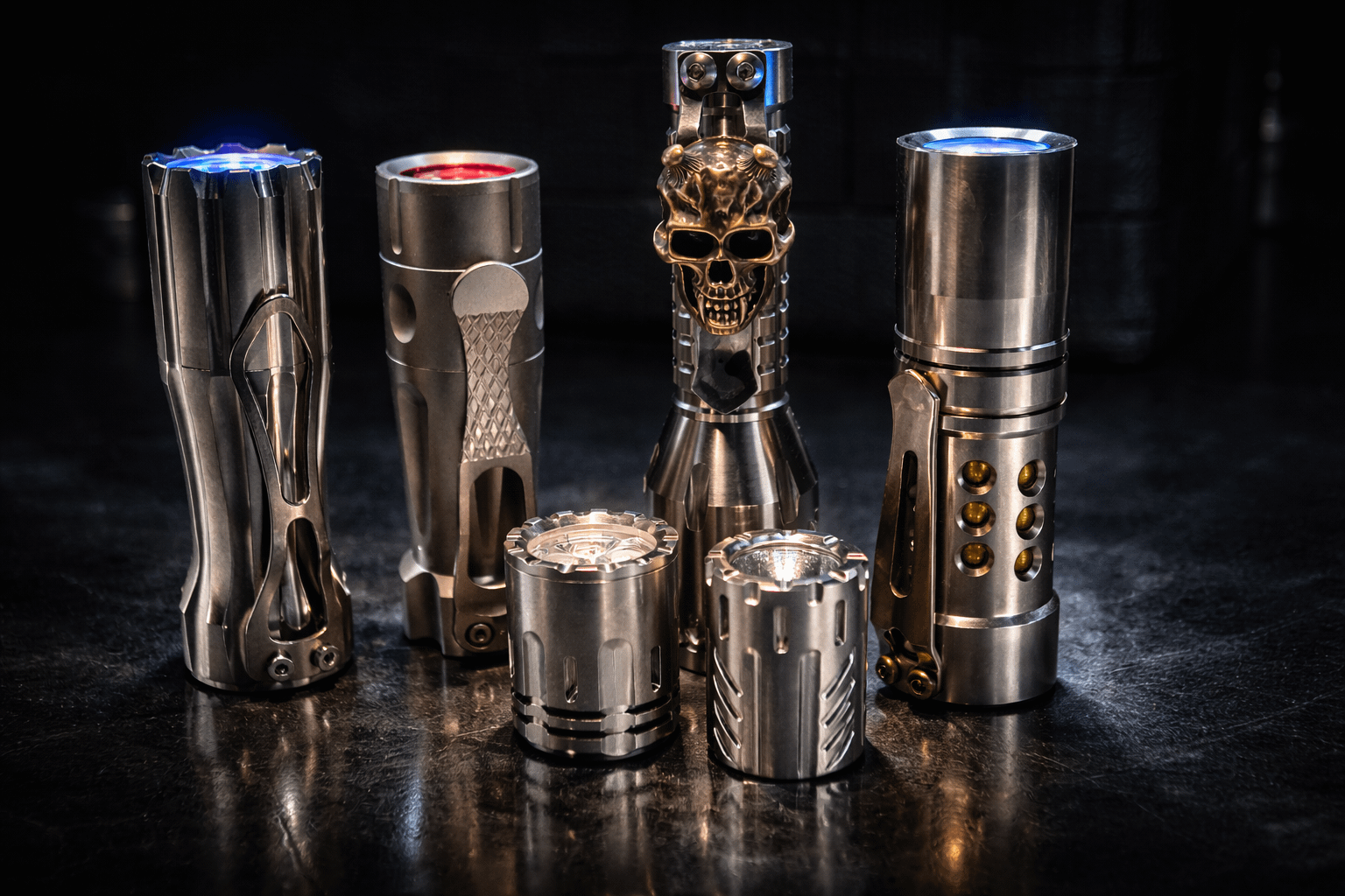 The first two lights from the left are "subtle clones" by Mack Walker. The one on the far right is the well-known and well-loved Maeerxu DF02. However, I’m completely stumped by this "skull masterpiece" with the three interchangeable heads. The largest one runs on an SFT40, one is a 1:1 glow arrow, and the last one features a 3-LED setup plus a secondary yellow channel.