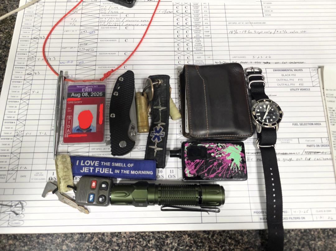 Top row: Fisher AG7 on my ID badge lanyard, Hinderer XM-18 3.5 inch blade, house keys, Hanks leather bi-fold wallet, Maratac LSA watch on a four buckle Zulu strap.