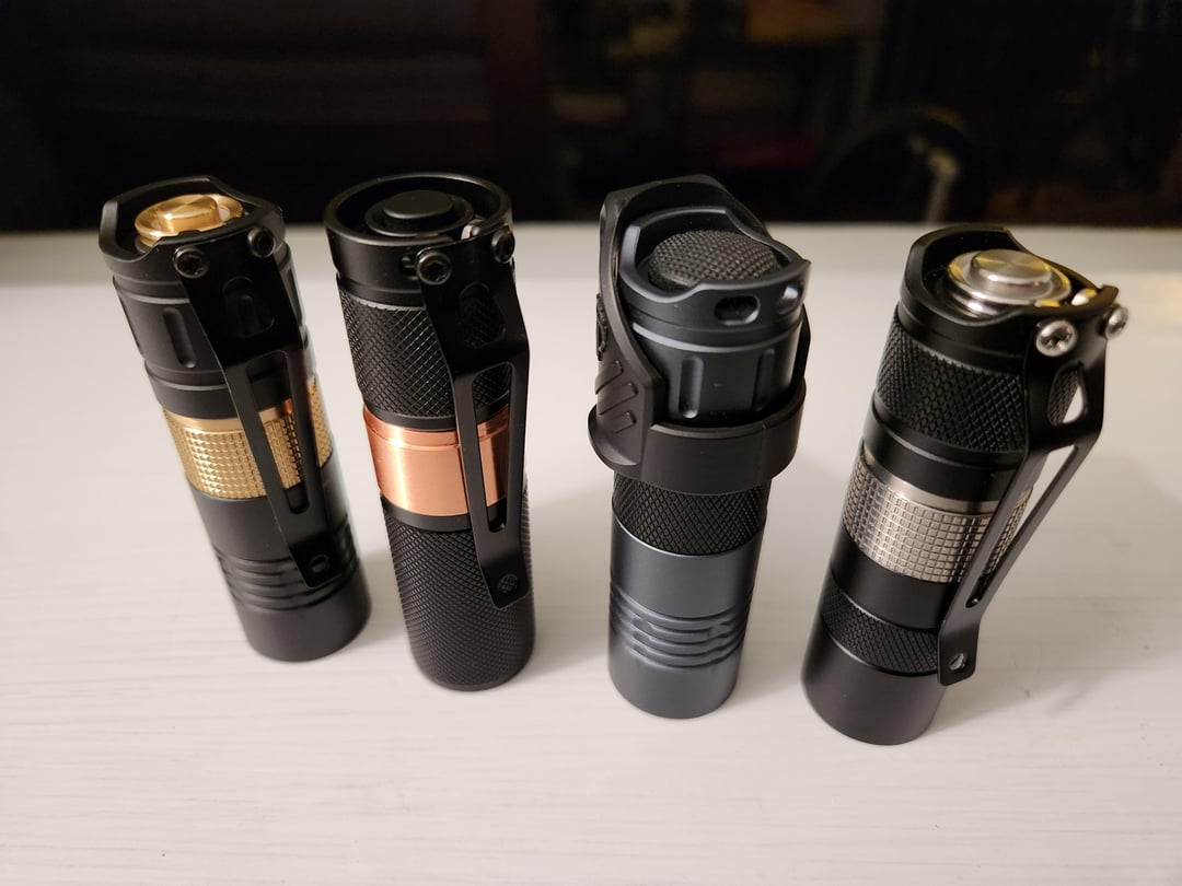 The metal buttons all have double o-rings under the flange so that they tail-stand. The grey light with the LPC clip has a forward clicky switch for momentary operation. All four shorty tube materials are represented here — brass, copper, aluminum, and titanium.